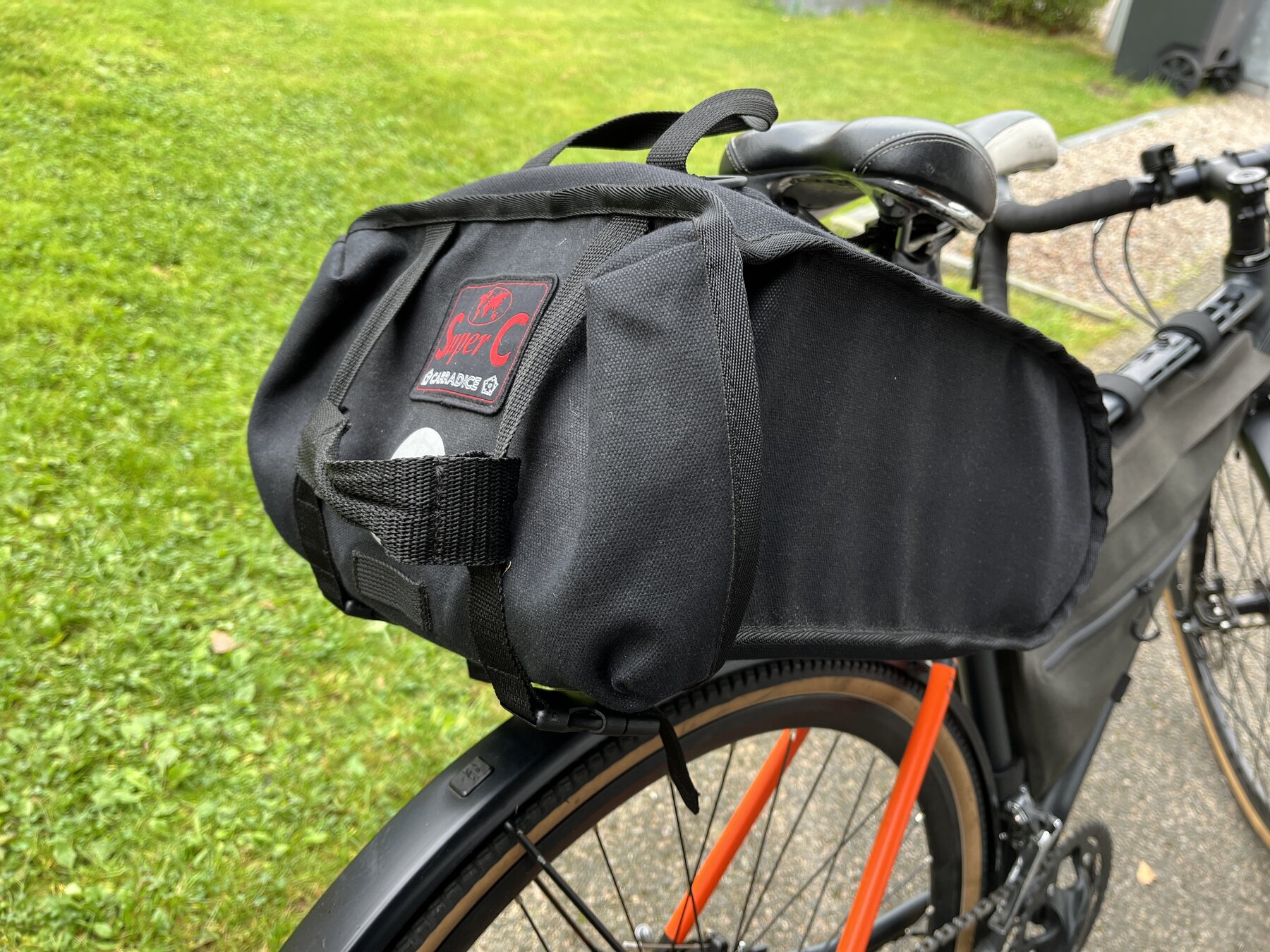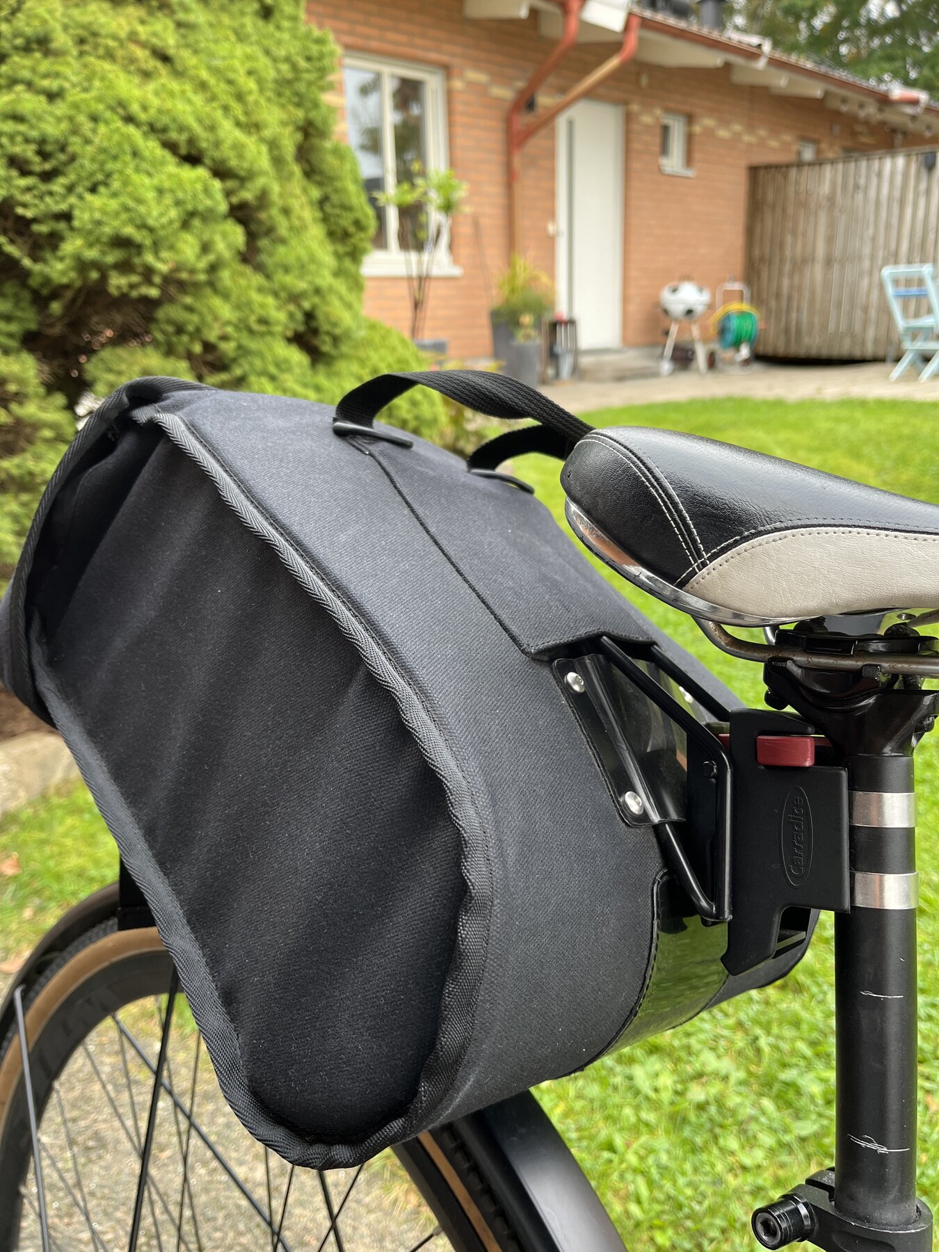 Fästes på sadelstolpen. (OBS rekommenderas ej för sadelstolpar gjorda av kolfiber, kräver ett visst utrymme mellan hjulet och väskan = sadelstolpen måste vara på en viss höjd)