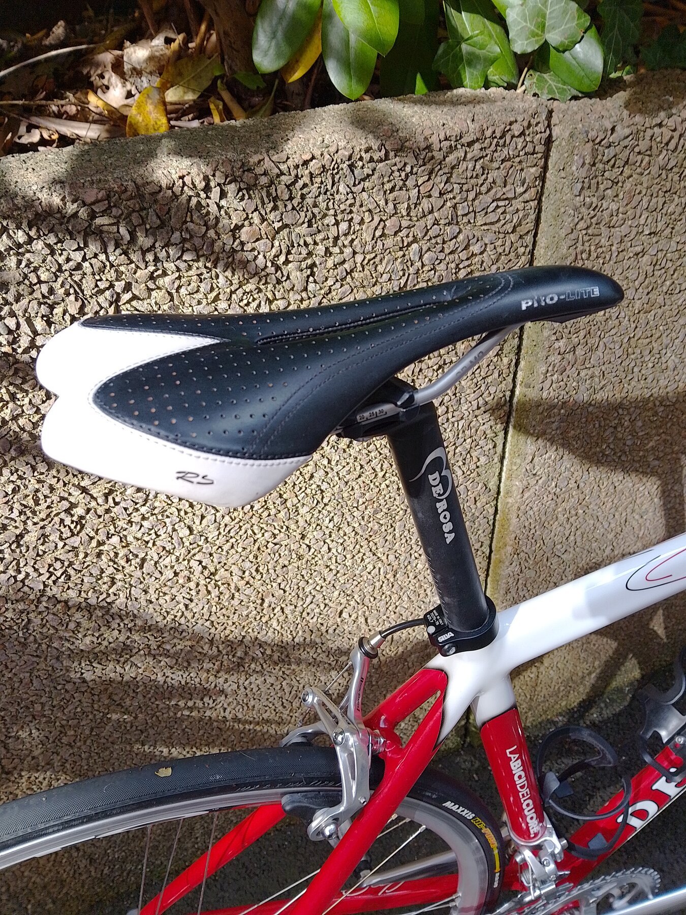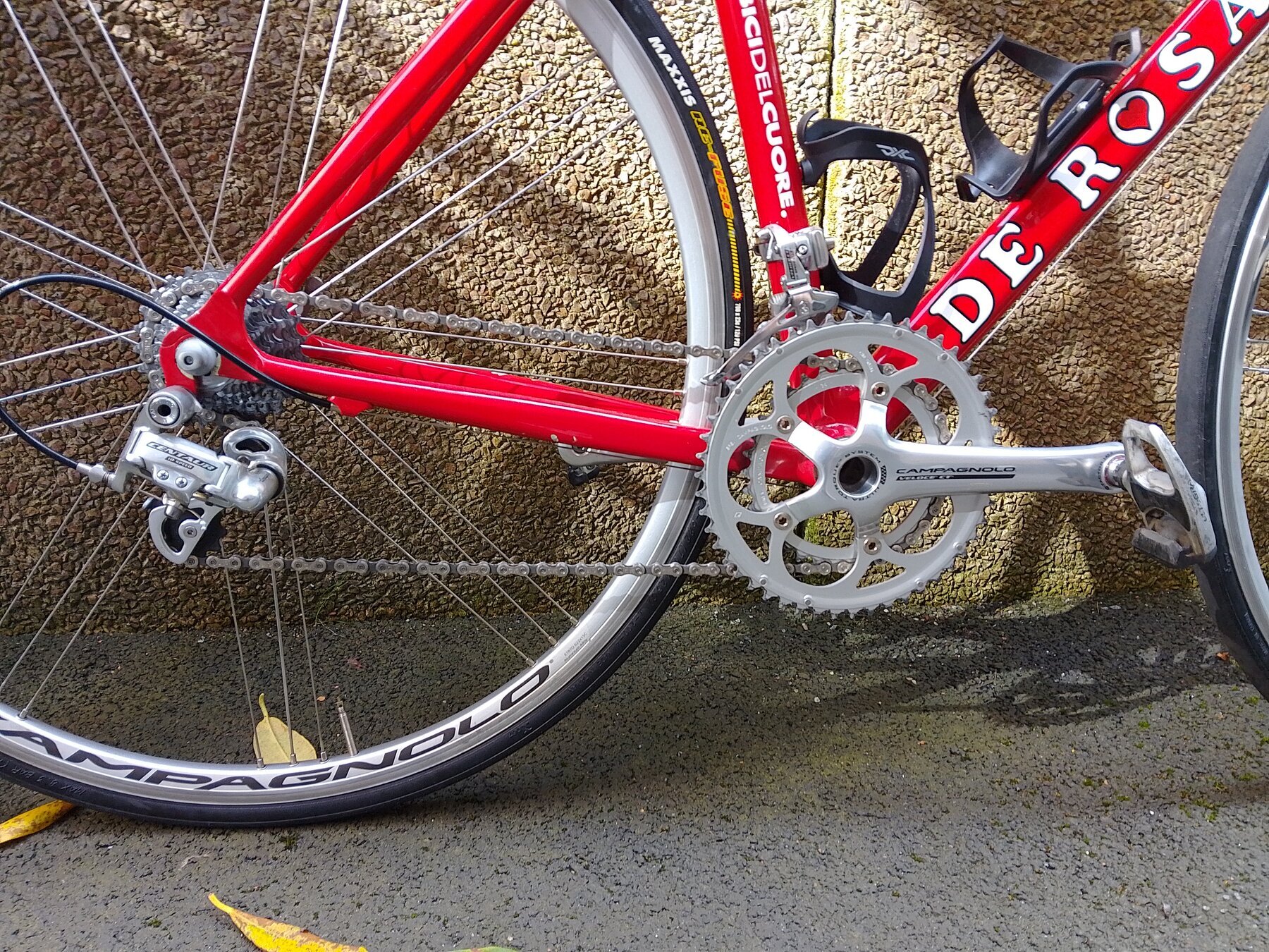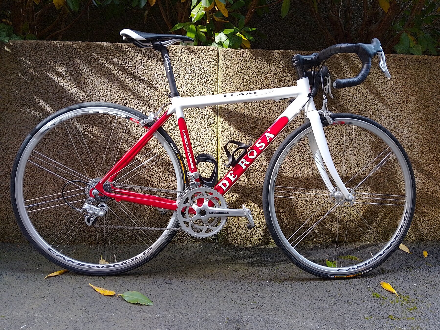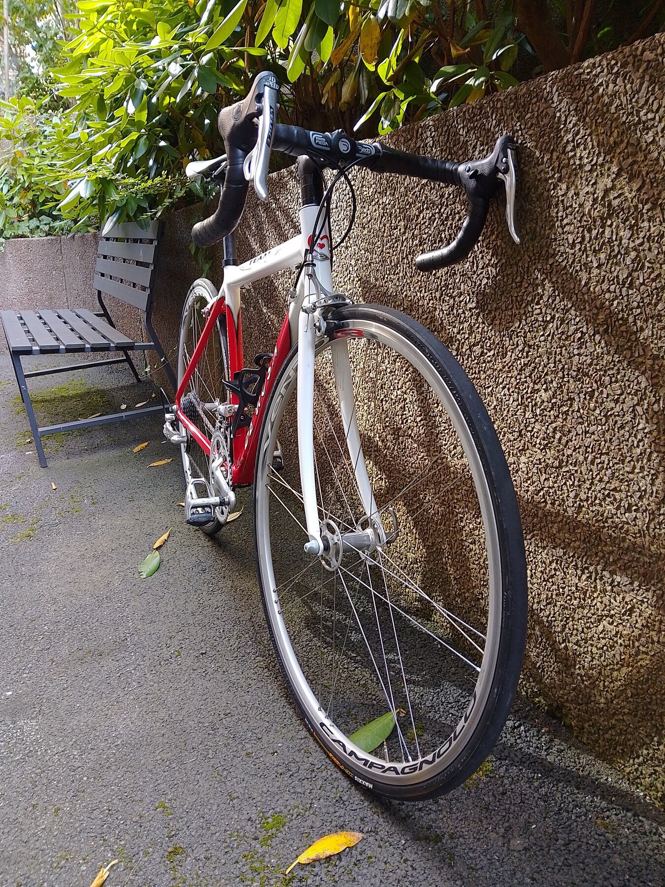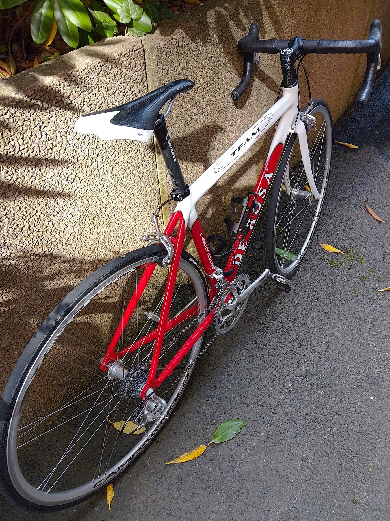 Riktigt lätt, bara 8,5 kg, rapp och responsiv. Genomgående Campagnolo Veloce 2 x 10 förutom bakväxeln (Campagnolo Centaur), fälgbromsar, Campagnolo Vento-hjul, QR fram och bak. Funkar hur bra som helst, sonen behöver bara en större ram. Pedaler och flaskhållare ingår, om du vill.