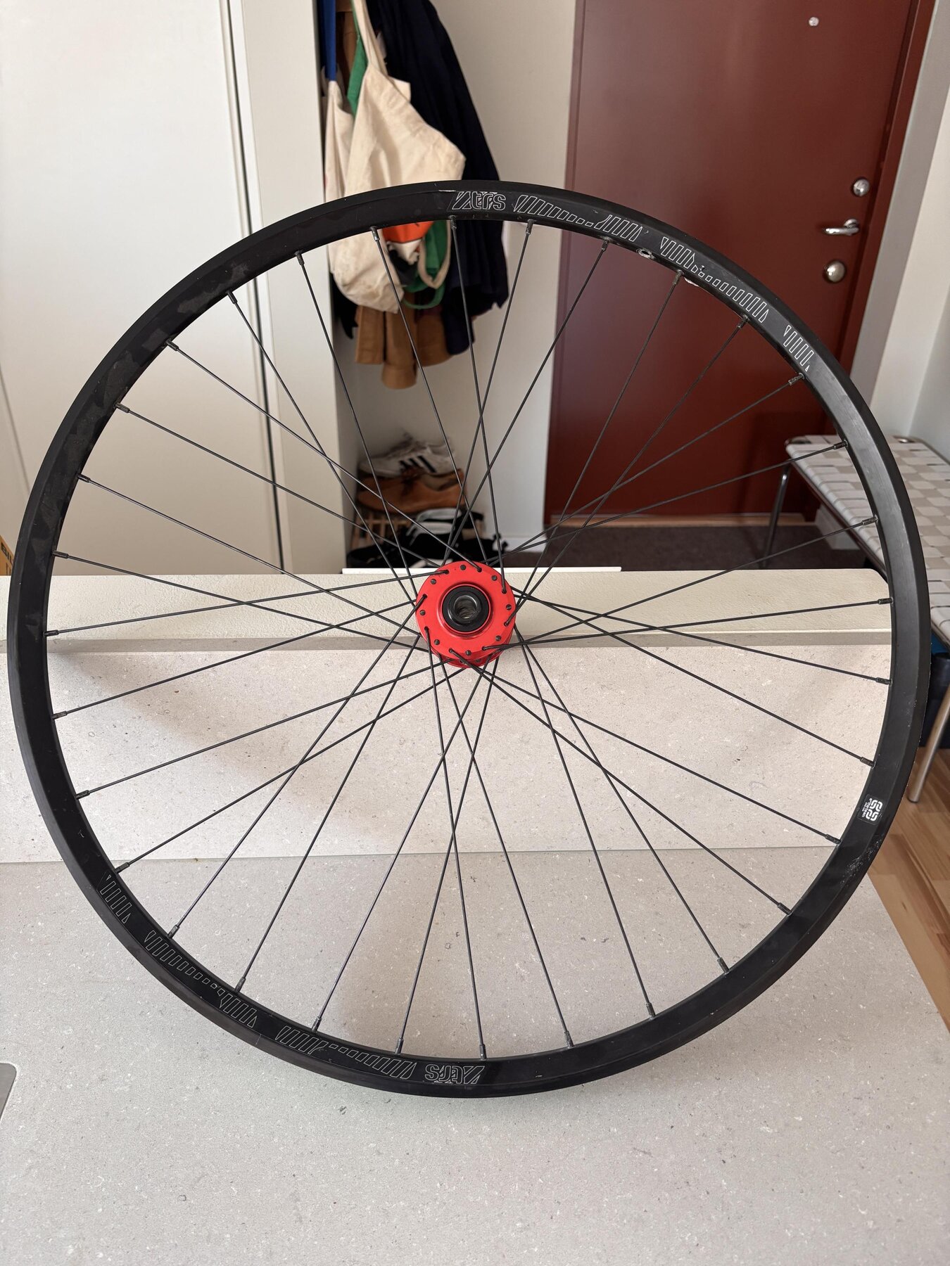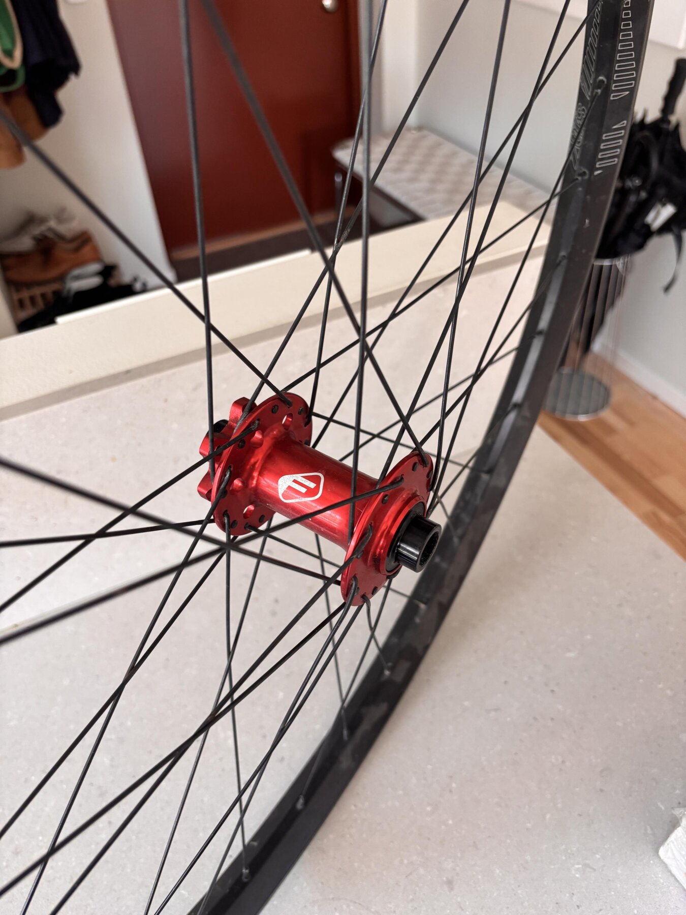 Eftersom jag ville ha samma hjul fram och bak bytte jag nu ut framhjulet som satt standard på min Commencal Meta. Det är alltså: