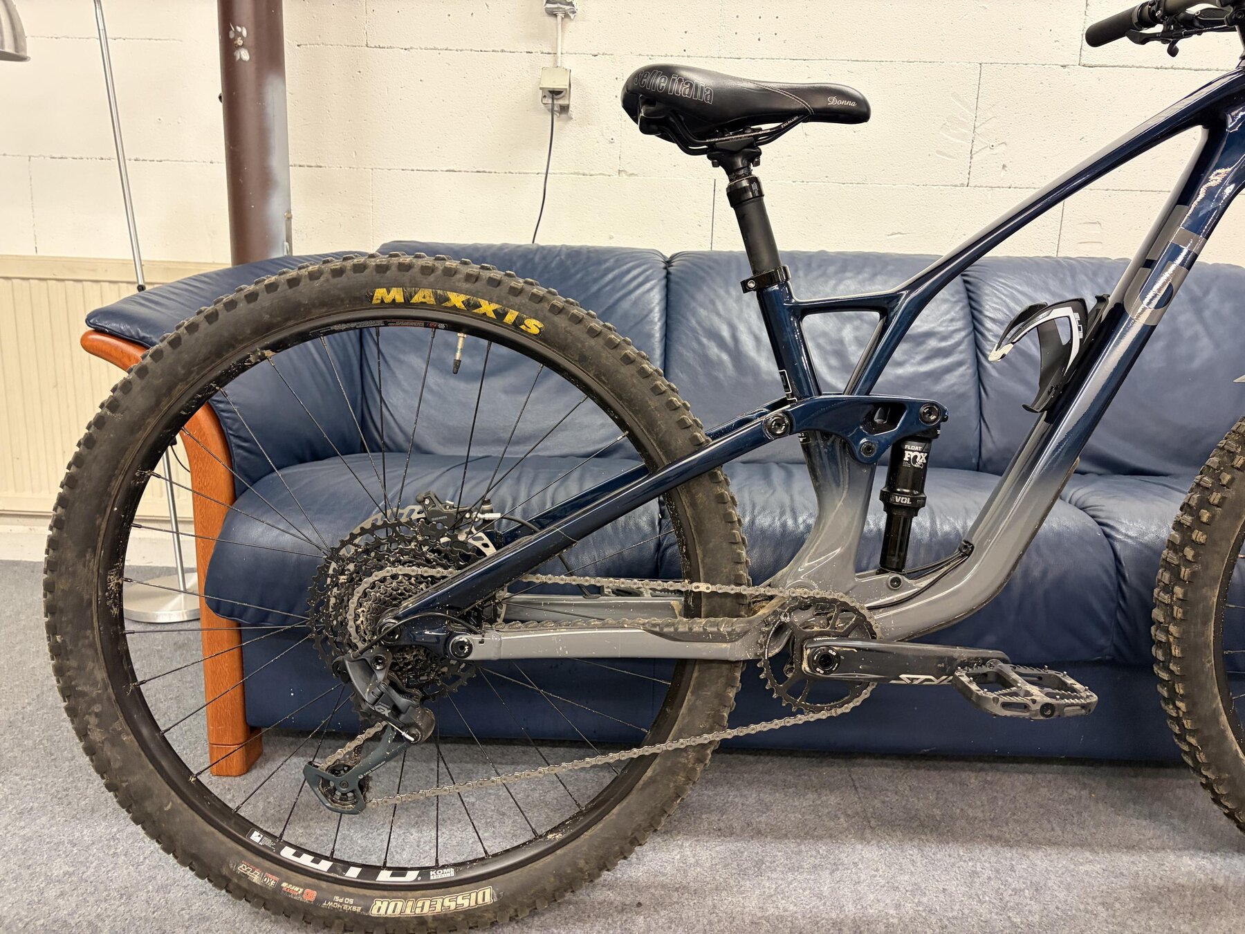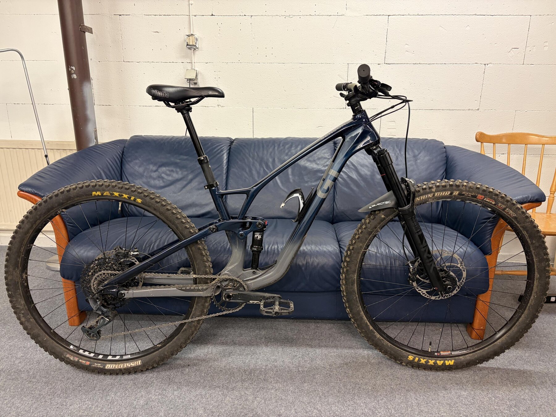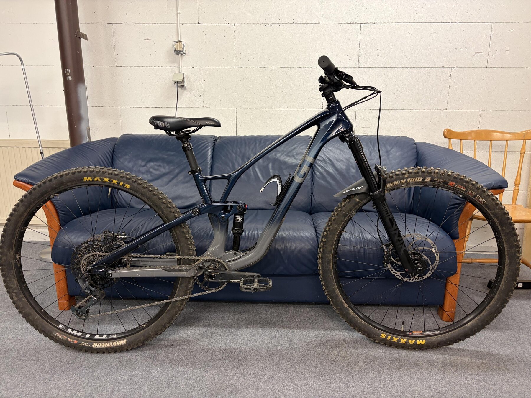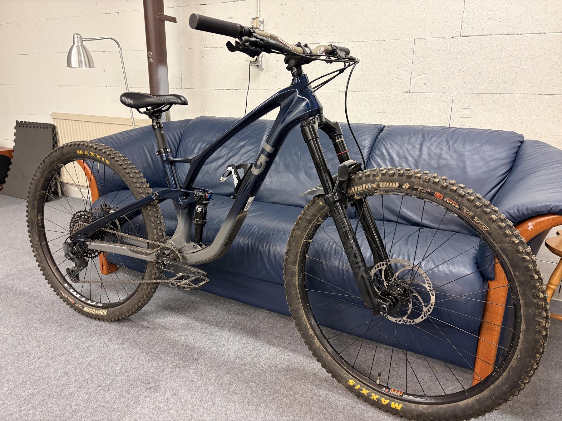 Carbon-ram, SRAM 12-växlad drivlina med GX bakväxel och NX trigger, SRAM G2 RSC bromsar med 203mm bromsskivor från Magura. Hjulen är 29” WTB KOM Trail i27 med Maxxis DHR2/Dissector 3C MaxxTerra EXO (äldre än cykeln). Cockpit är Renthal Fatbar-styre med 30mm rise kapat till ca 760mm med 35mm lång styrstam. 150mm dropper post. Säljes med annan sadel och basic pedaler.
