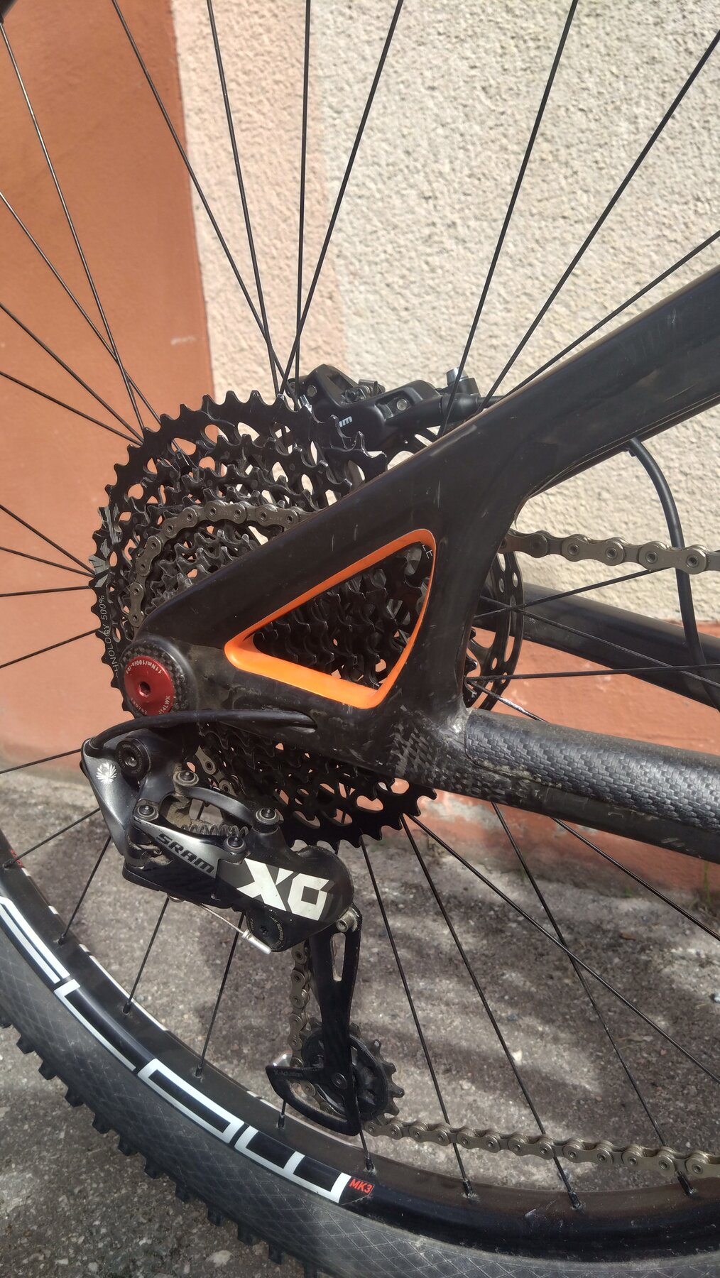Växlar, Sram X01 eagle 12 speed och 10-50 kassett. Sram G2r bromsar med fyrkolvsok o 180 mm skivor. Stans Flow hjul. Däcken är tubeless Schwalbe Hans dampf i ok skick.