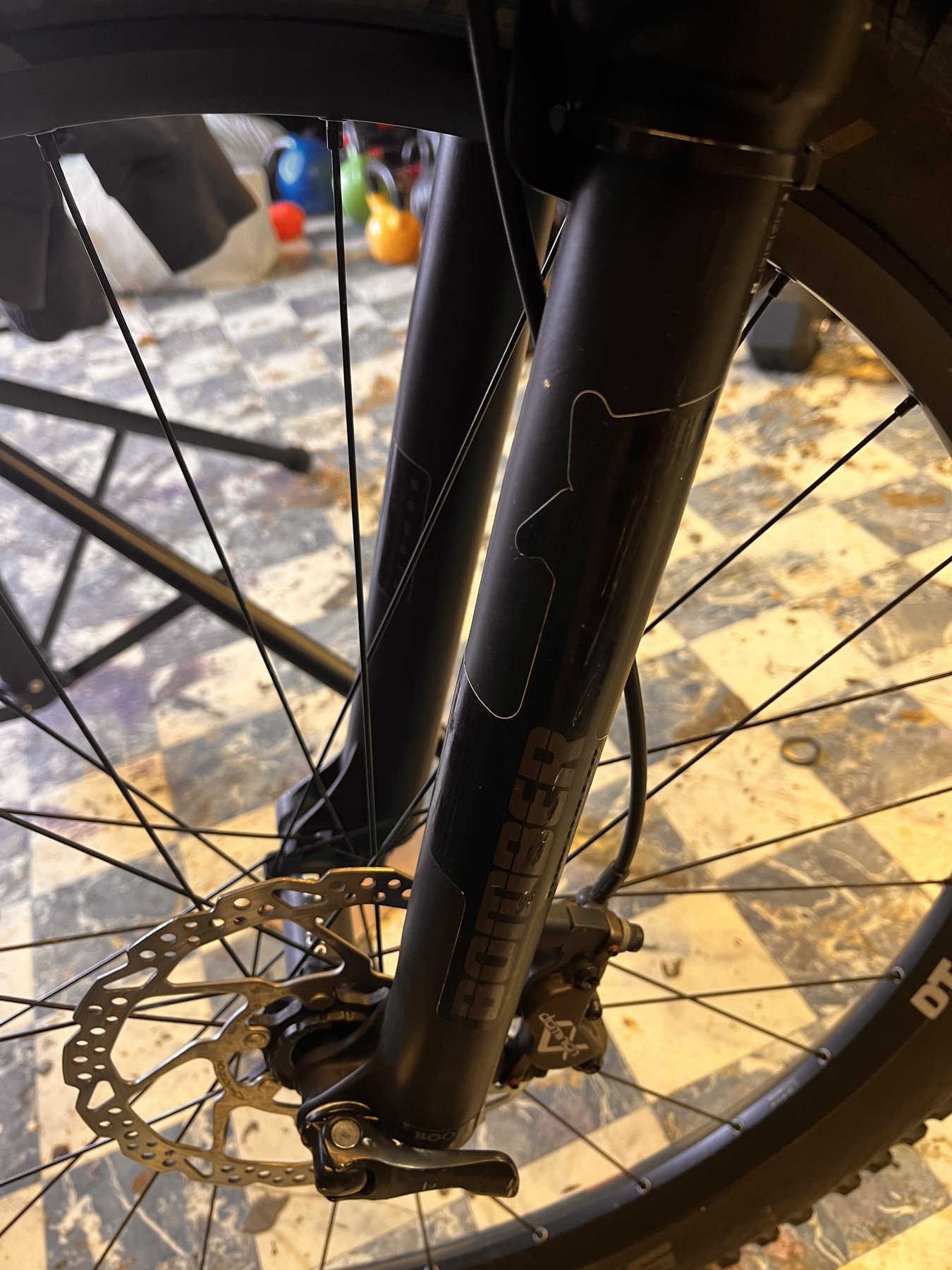 Gaffel - Marzocchi Bomber. 140 från fabrik men omgjord till 150mm. Vet inte hur det gjordes men det gjordes av en av de främsta på cykelgafflar. Är lätt att kolla hur om någon vill veta.