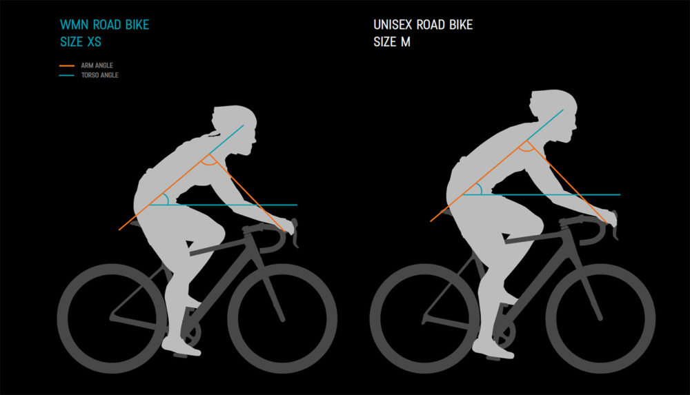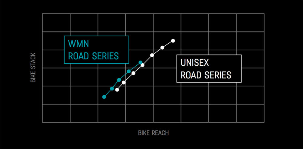 CanyonWMN-modellerna har kortare reach och högre stack jämfört med unisex-ramarna.De nya dammodellerna finns i storlekar ned till 3XS och passar cyklister från 152 centimeter. Små ramstorlekar i kombination med normala 700c-landsvägshjul ger dock ofta ett oproportionerligt förhållande mellan hjul och ram. För att få plats med de stora hjulen så flackas ofta gaffelvinkeln ut vilket leder till längre hjulbas och inte lika alert uppträdande som hos de större storlekarna.