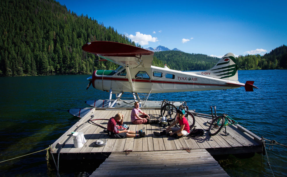 Kanadaresan började knaggligt med en borttappad cykel, men som om ödet var på min sida, dök cykeln upp klockan tre natten innan vi skulle iväg. Efter att halvsovande ha satt ihop den bar det iväg och nu sitter vi alltså här – fyra ivriga cyklister och tar en miljon foton från de små fönstren på planet. Efter drygt 45 minuter går vi in för landning. Piloten styr planet mot en klar blågrön sjö högt uppe på en bergsplatå. Han cirklar ett halvt varv runt sjön medan han sjunker i höjd. När det känns som om vi ska nudda grantopparna, styr han planet rakt ut mot sjön, gör en perfekt landning, och lägger till vid sjöns enda lilla brygga. Hjärtat slår i 200 km/h under hela landningen. Det är så häftigt och samtidigt så otroligt läskigt.