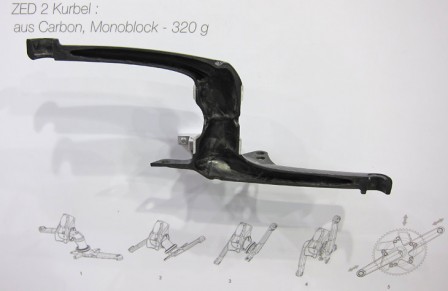 Vevpartiet Zed 2 är i kolfiber och är gjort i ett enda stycke vilket innebär att det måste träs in i ramen, likt gamla tiders Fauber-vevpartier.