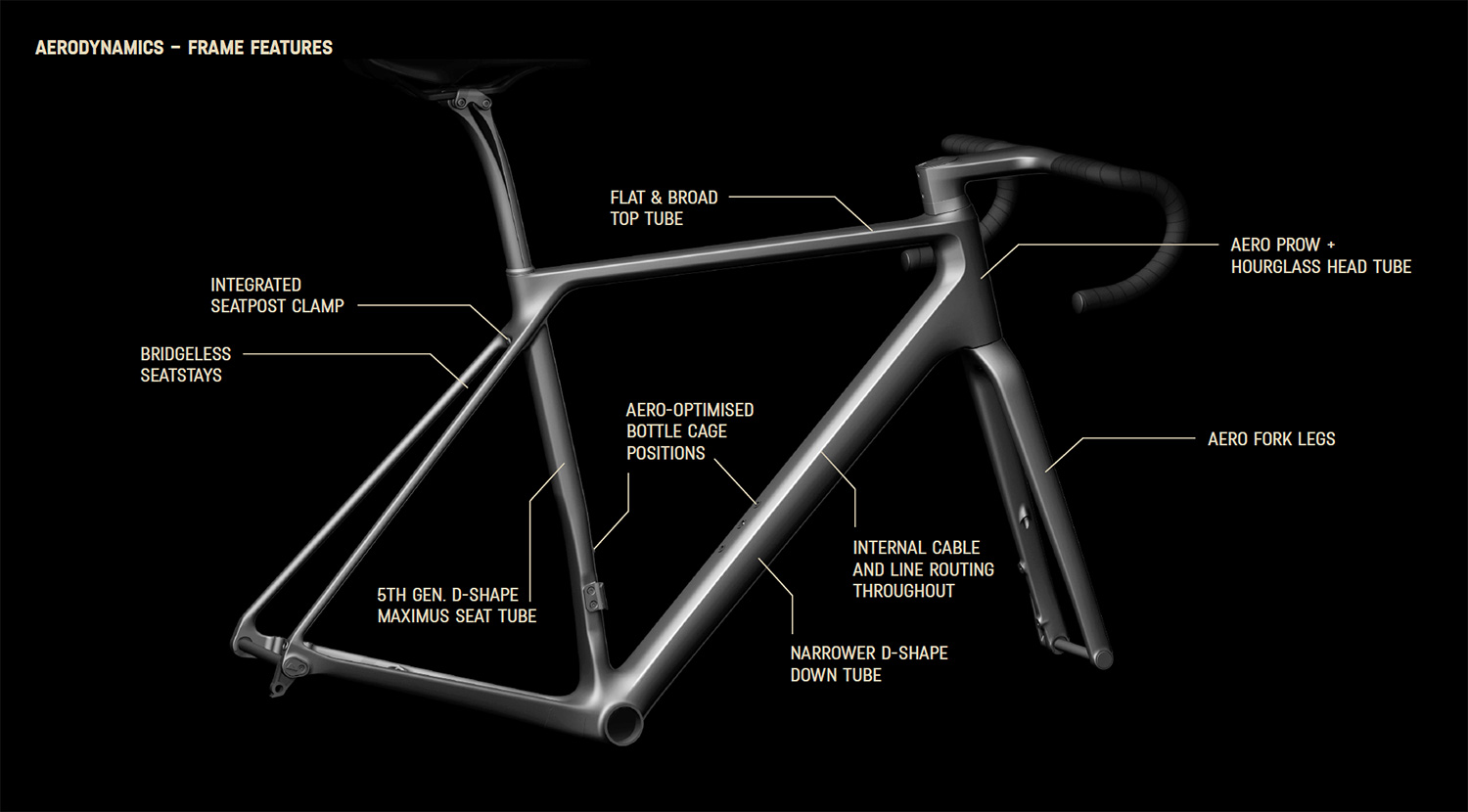 CanyonTrots att det handlar om en komfortmodell har mycket arbete lagts på aerodynamiska detaljer.Vindtunneltesterna har resulterats i en hel del aerodynamiska detaljer på ram och gaffel som timglasformat styrrör, smalare D-format underrör, aeroprofil på gaffelbenen, intern kabeldragning och flaskställens placering.