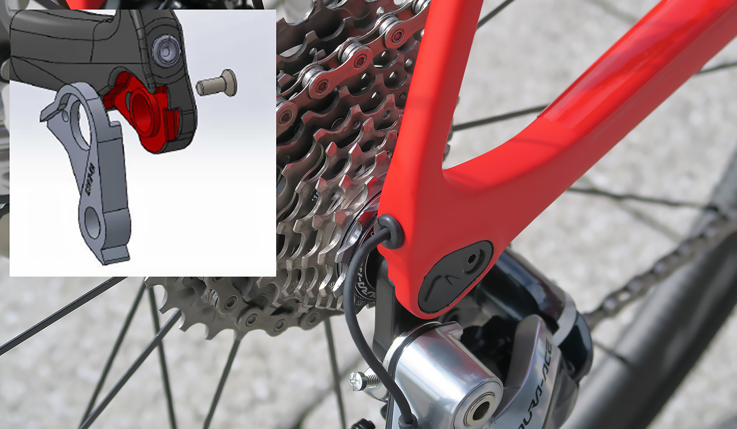 Anders Jansson / CanyonNy design av växelöra. Täcklock för den genomgående axeln ger ett snyggare utseende.Växelörat har fått en ny design där det är den genomgående axeln och navet som fixerar växelörat. Det ger en styvare konstruktion men främst så påverkas ramen mindre vid en krasch när växelörat går av eller böjs.