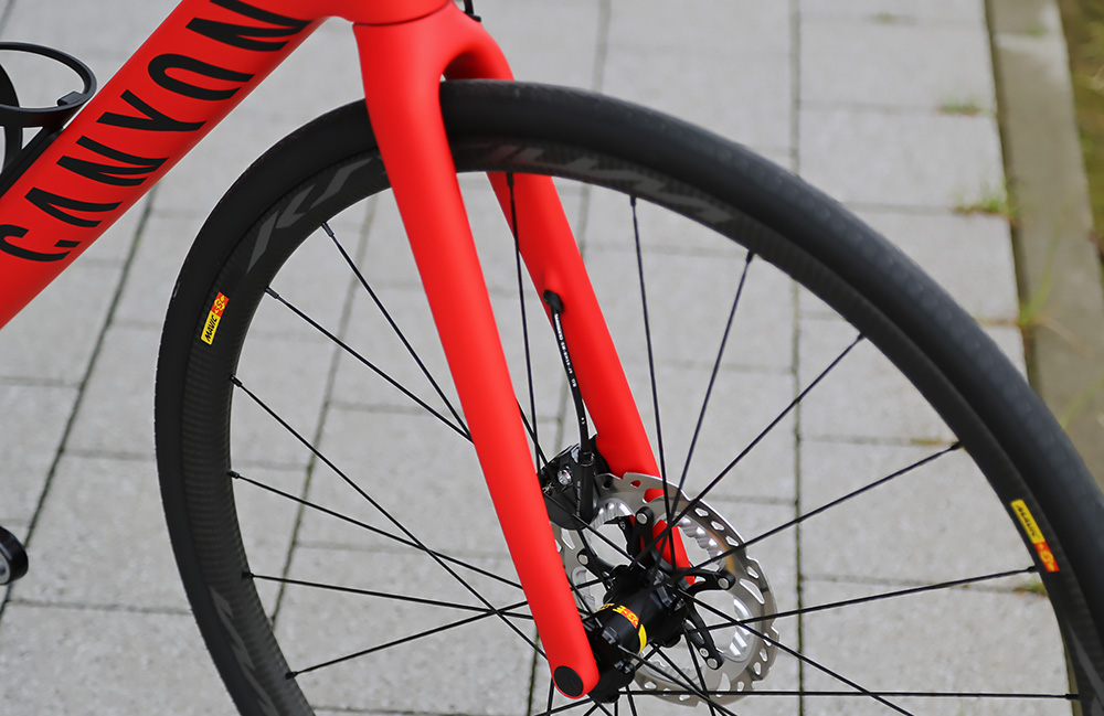 Höjden i fronten beror av styrrörets längd. Ett allt för högt styrrör kan dock ge cykeln proportioner som inte upplevs estetiskt tilltalande. Canyon har löst detta genom att förlänga framgaffeln en aning och låta den ta en del av höjden. Det ger samtidigt bättre utrymme för större däck i gaffeln. Endurace CF SLX har 33 mm i däckutrymme i ram och gaffel vilket i praktiken innebär ett 28 mm däck på 21 mm fälg.