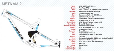 Testcyklarna var top of the line-kittade Meta AM byggda på förserieramar. Cykeln hade en Fox 32 Float 150 RLC med kashima-behandlade innerben, Formula-bromsar, SRAM X0-drivlina med 26/39-klingor fram och hjul från Fulcrum. Däcken kom från Onza, Ibex FR 2.25″ fram och Canis 2.25″ bak. Sadelstolpen var en Reverb från Rock Shox. Cykeln i storlek medium vägde 12,7 kg komplett, utan pedaler (enligt Commencal). Jag cyklade på en Large, men med 70 mm styrstam vilket gör den något kvickare och mer utförsfokuserad än med den 90 mm långa styrstam som Commencal planerar att montera på storlek L från fabrik. Styrbredden var 710 mm, mot de 730 mm som sitta som standard på samtliga modeller.