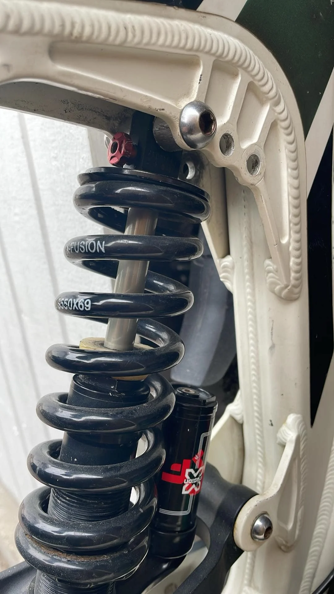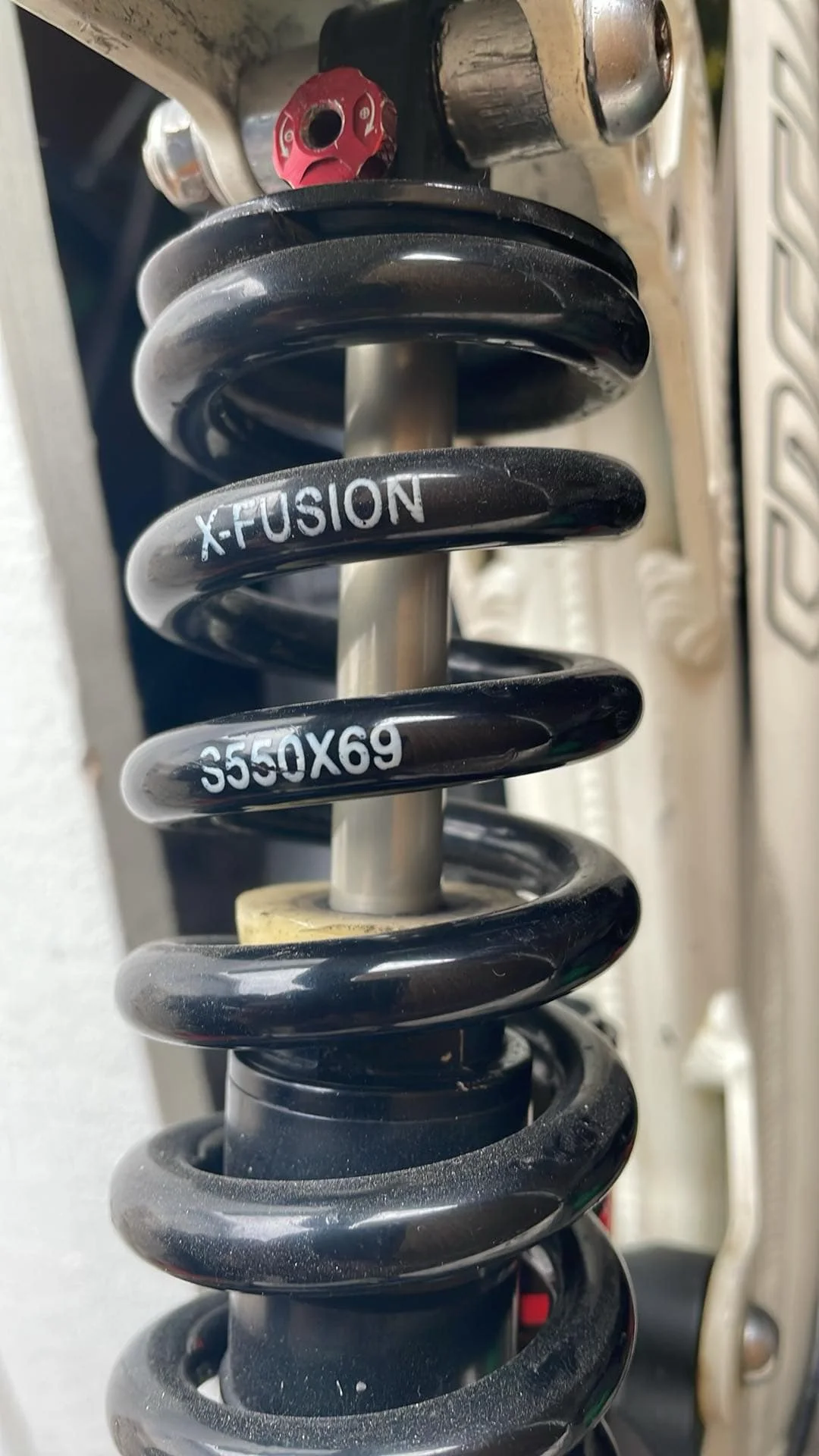 Bakdämparen är en X-fusion Vector och just nu sitter en 550 lbs coil på, men behöver en fjäder som är typ 300-350 lbs istället, som passar sonen på ca 50 kg.