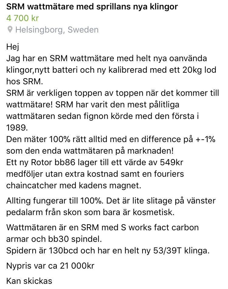 ”Hej, jag köpte en cykel för 100000, cyklade fem dagar och nu är den till salu. Jo, just det ja, jag körde sönder en eker också, men det får du fixa själv på en beggad cykel för 65000.”