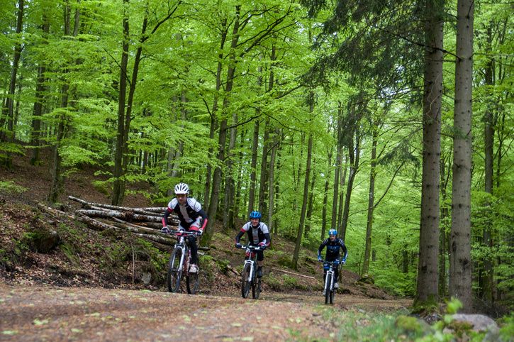 Bilden nedan är tagen av Christina Fryle från Varbergs Fotoklubb under en provcykling av delar av bansträckningen. Det är Gergö, jag och Oscar som bränner på längs en skogsväg i Grimeton skog.