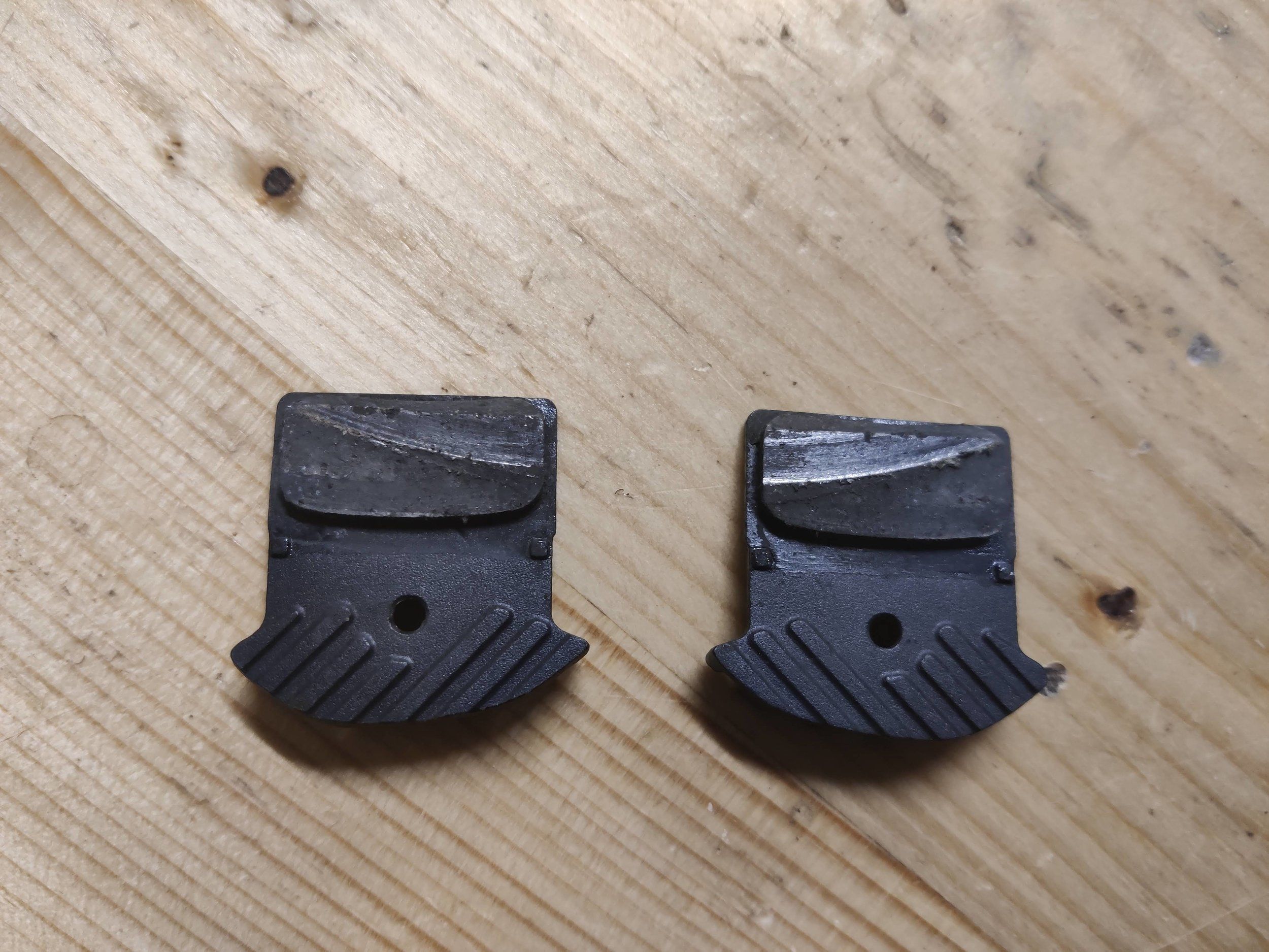 Har bytt framgaffel på pendlarcykeln, och fick då IS-fäste för skivbromsen på nya gaffeln. Införskaffade en adapter (FS-MA-F160P/S), vilket borde vara rätt, men oket sitter ändå inte som det ska utan för högt/långt ut så att bara en del av bromsbelägget hamnar på skivan. Det var rätt svårt att få en bra där man ser exakt hur oket sitter i förhållande till skivan, men bilden på bromsbeläggen visar problemet tydligt.