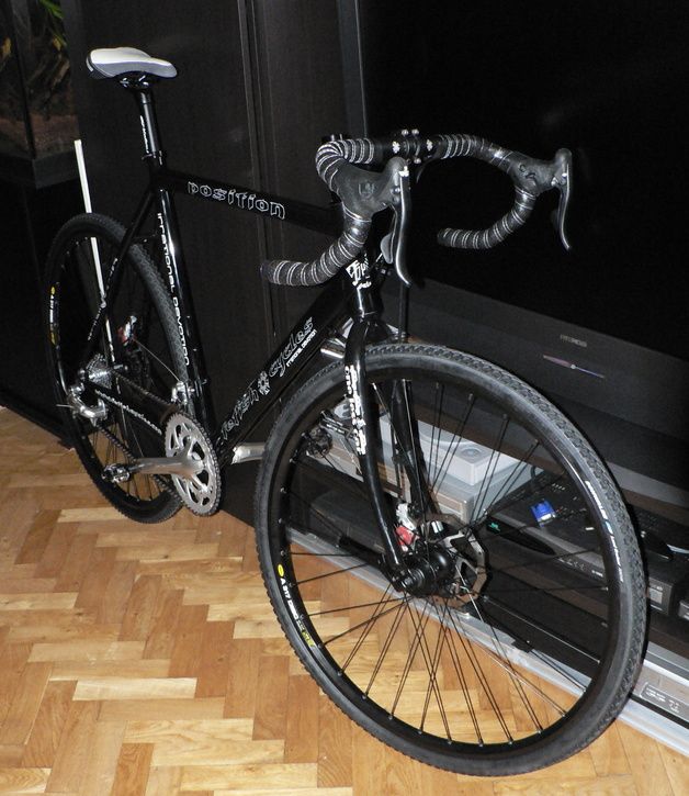 Salig röra av komponenter, fram/bakväxel/kassett shimano 105, vevparti/lager shimano tiagra och reglage campa xenon. Bromsarna är Avid BB7 road.