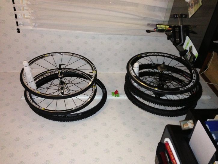 Hej o tack allesammans för all inspiration. Googlade och fann en tavelhylla på 150 cm från Rusta. Kostade 200 kr och fanns i björk(?), svart och vitt utförande. Får se om 3 skruvar räcker för 10 Kg eller om jag måste borra ytterligare hål. Mitt ögonmått ansåg att 150 cm skulle vara tillräckligt långt för att båda hjulen skall få plats med marginal. Det fanns även 120 cm och ännu kortare.