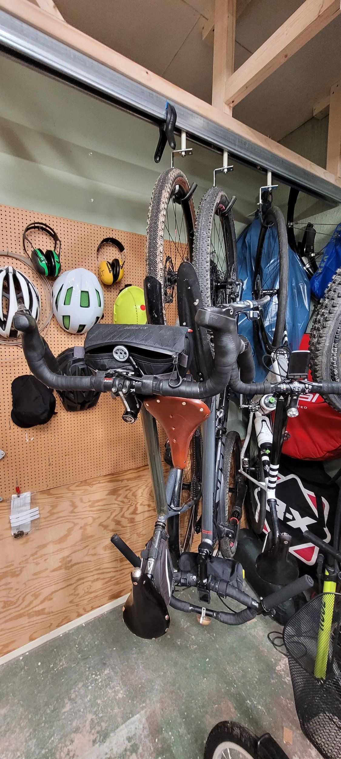 Planen är få upp tre cyklar där det nu hänger två, samt hänga två på en annan vägg. Och låta skete-mtben stå i förråd. Blir nog bra. Måste hitta vettig borrmaskin att låna bara...