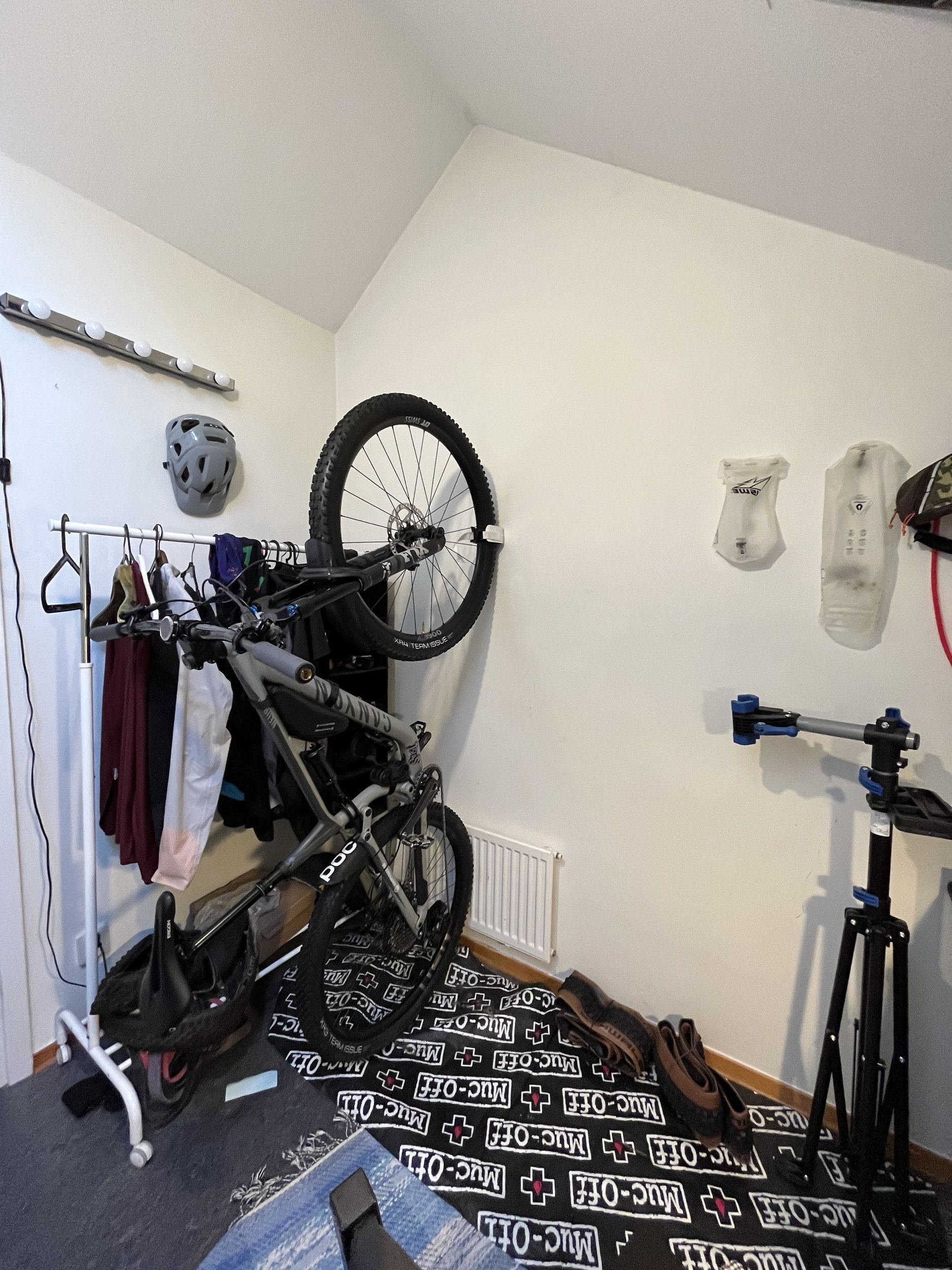 Biltema har en klämma för mountainbikes som man sätter på väggen (klämman alltså), och som håller fast/balanserar hojen i framdäcket. En sådan vore käck för att ställa hojen på bakhjulet här, och således spara lite plats på djupet, besudling av den vackra tapeten till trots.
