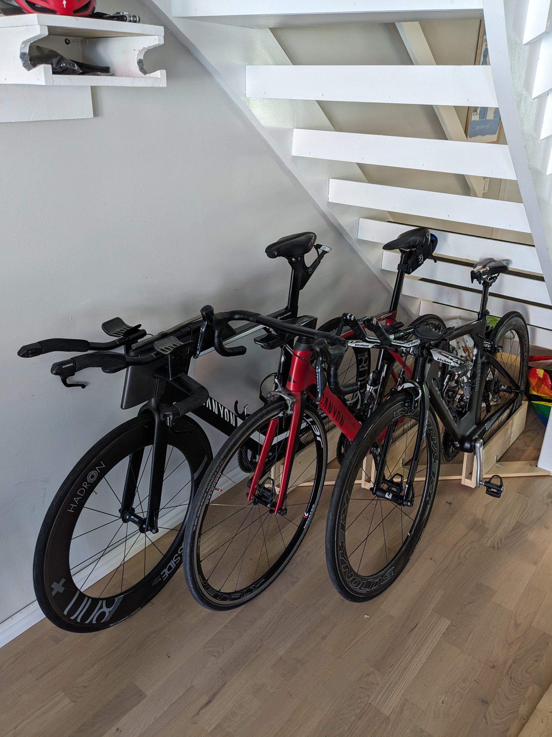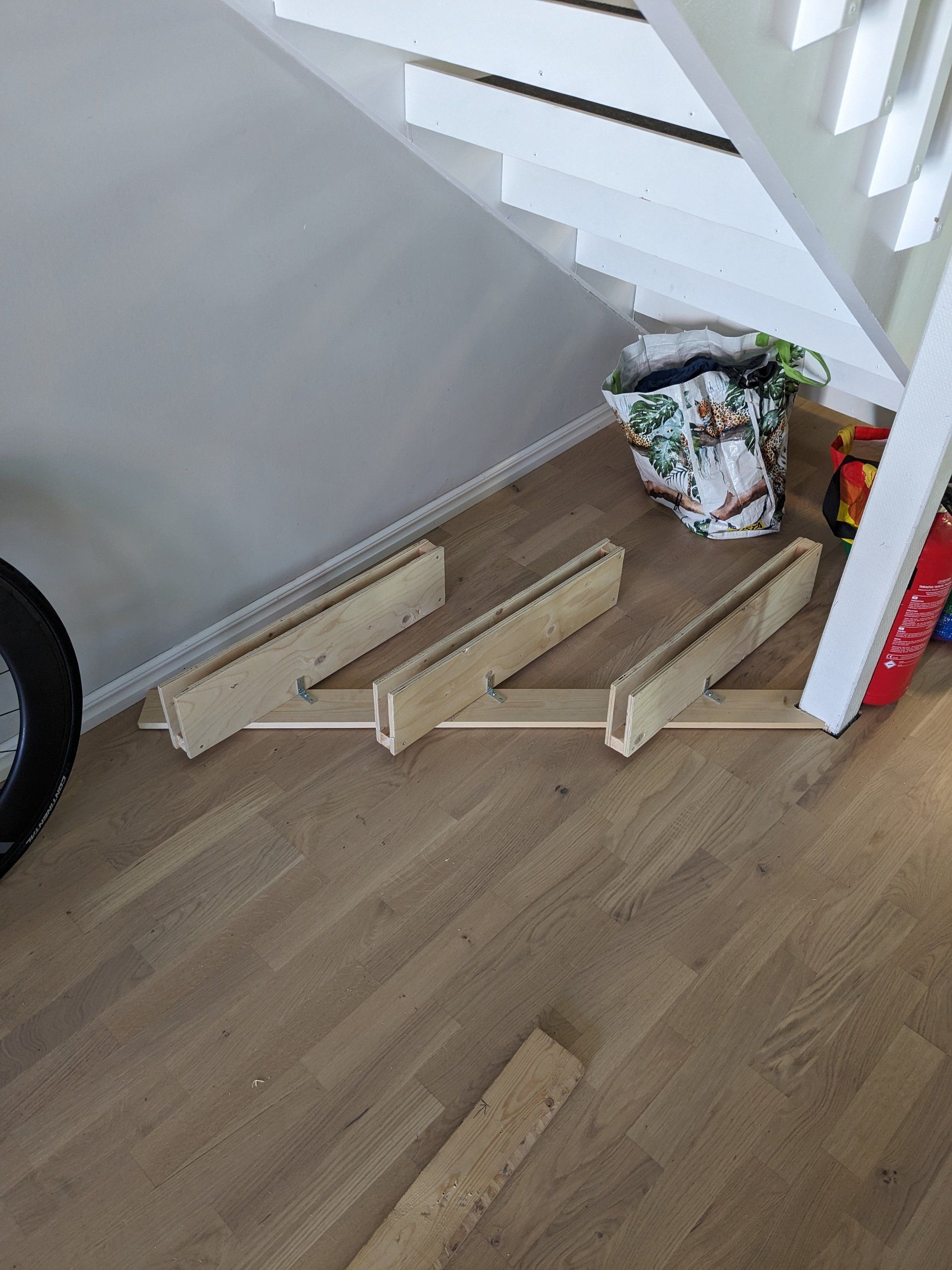Fuuuusk med sådär smala styren?Funkade inte riktigt med tre cyklar på väggen, men nu är hålet under trappen lite mer optimerat.