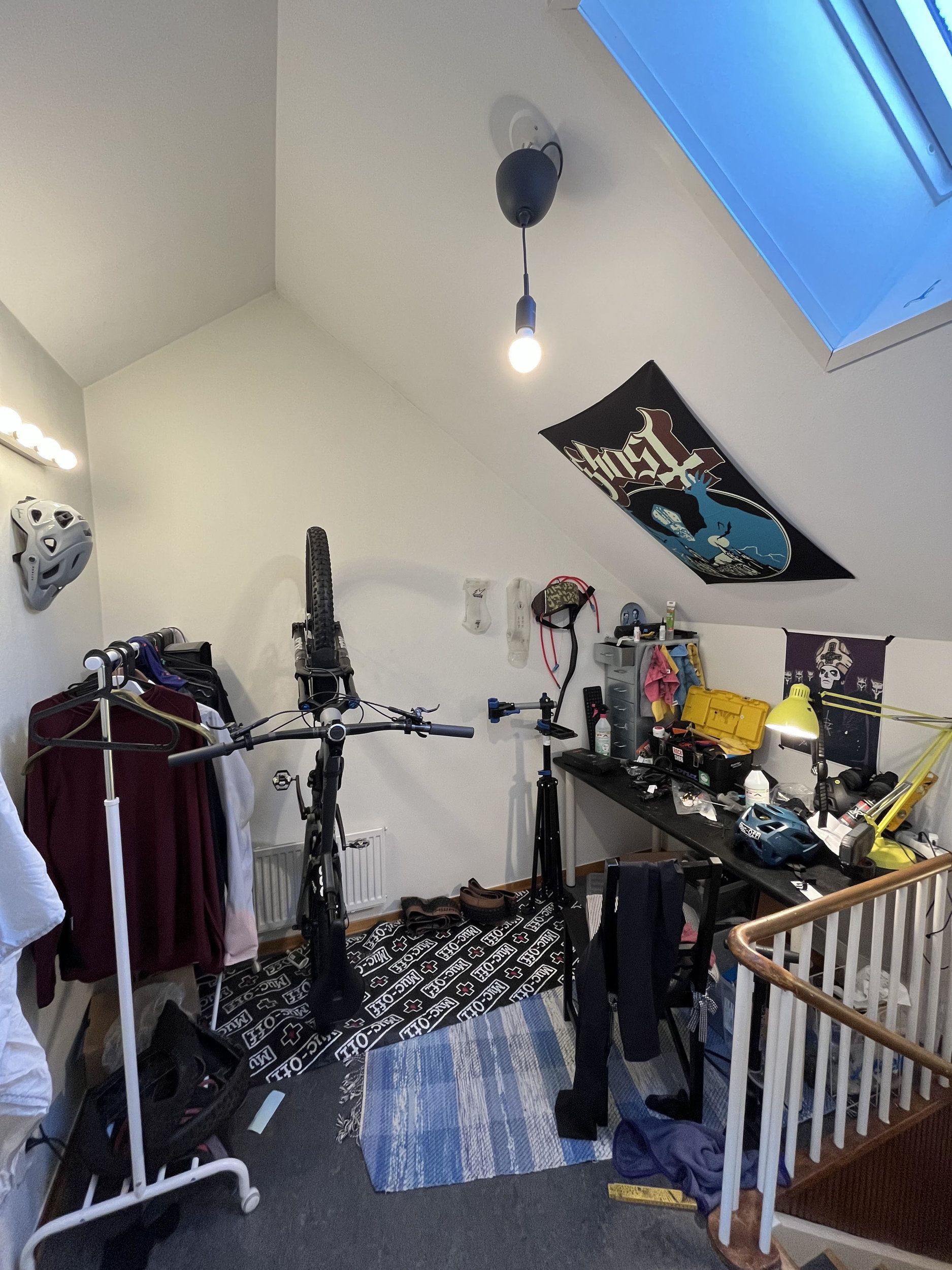 Du får ju plats med några cyklar till på den väggen ?På övervåningen har jag en egen liten del, precis uppför trappen bredvid en garderob.
