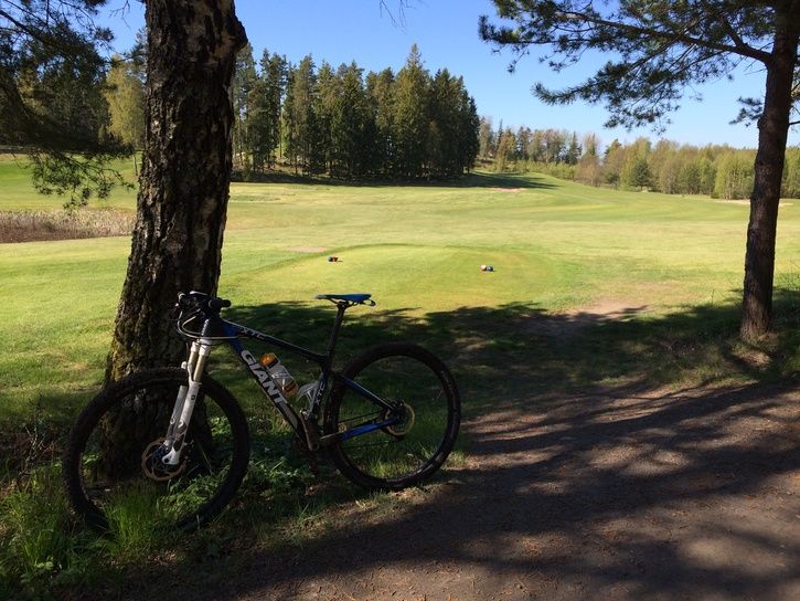 En cykel-mot-träd-bild från premiärturen med min nya cykel. Det hade börjat skymma, så bilden blev lite suddig tyvärr..