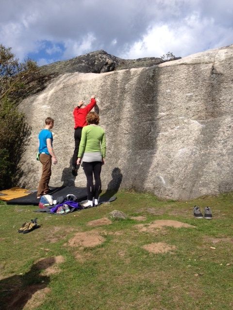 Klättring på vårdberget. Sol, moln, lite hagel.