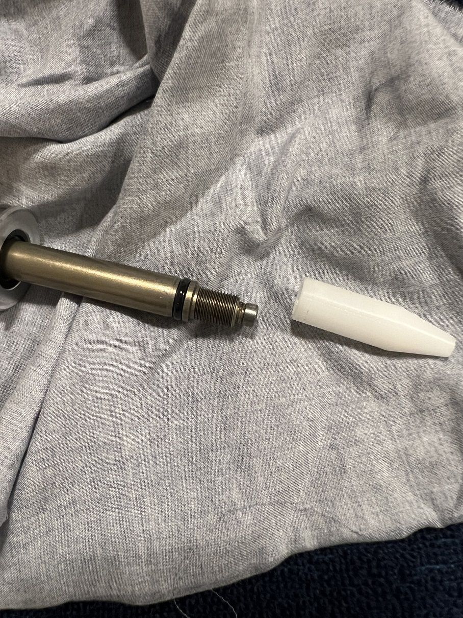 Slipa svetsa och svarva typ? Om man kan hålla den koncentrisk och rätt längd så borde det gå iallafall, kanske med ett kopparrör av rätt storlek. Men om man har tillgång till svarv skulle jag nog bara tillverka en i stålÄr det någon som kan komma med lösningsförslag på hur man finmekar den här så att den blir till en del igen istället för två?