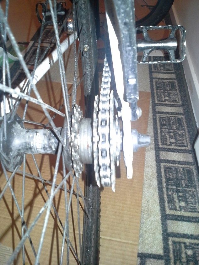 Vintercykeln får lite budgetlösningar, ville ha single-speed och hade ett gammalt bakhjul som fick komma till användning! Förhoppningen är att kedjan inte ska hoppa, trots "växel-kransar"!