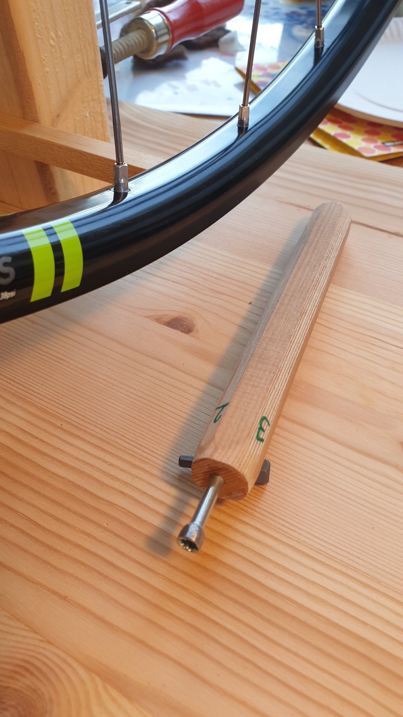Funkade fint! Först tänkte jag att jag bara skulle använda mejseln när jag monterade allt men sedan slutade det med att jag även spände och riktade hjulet.