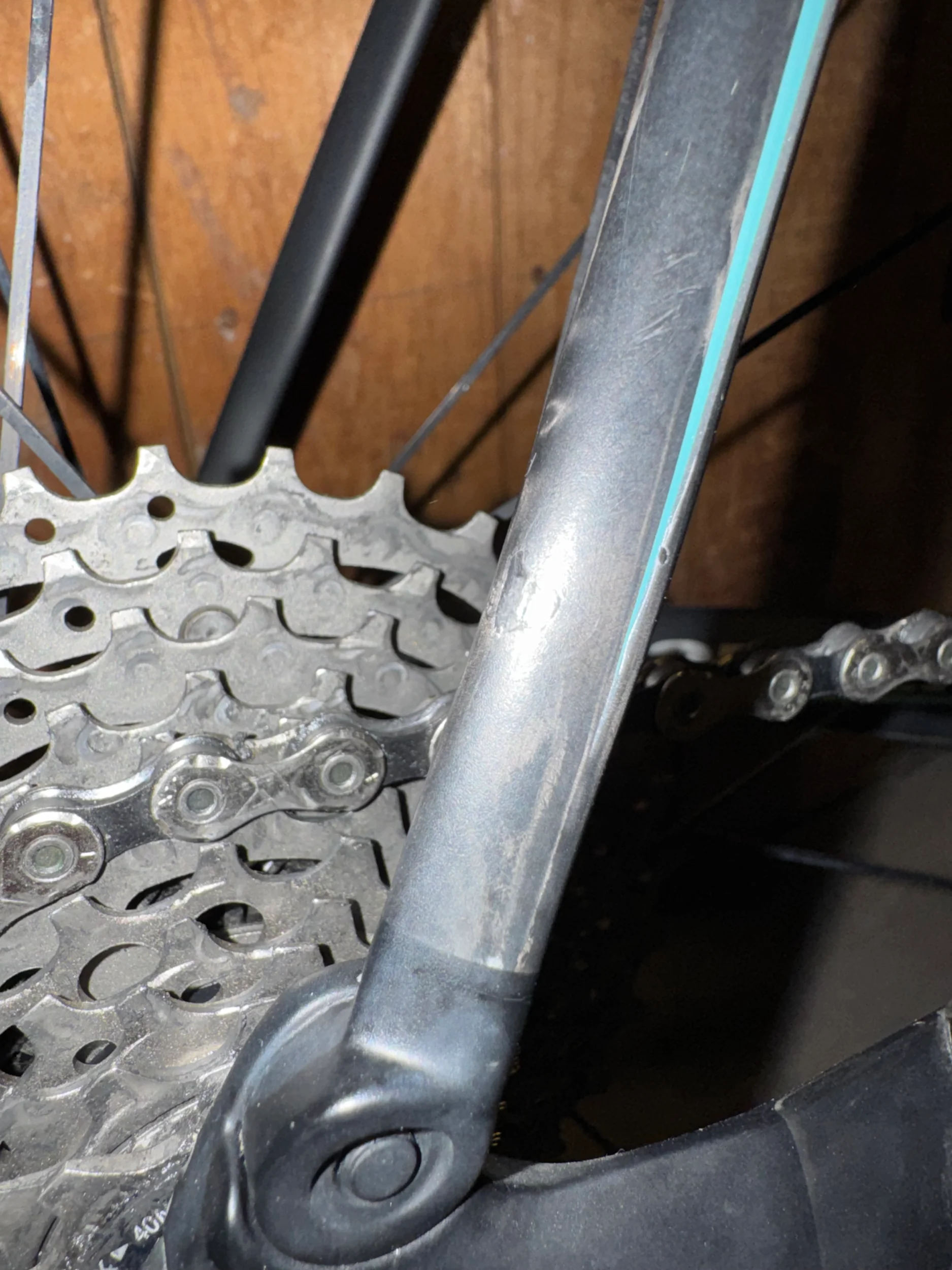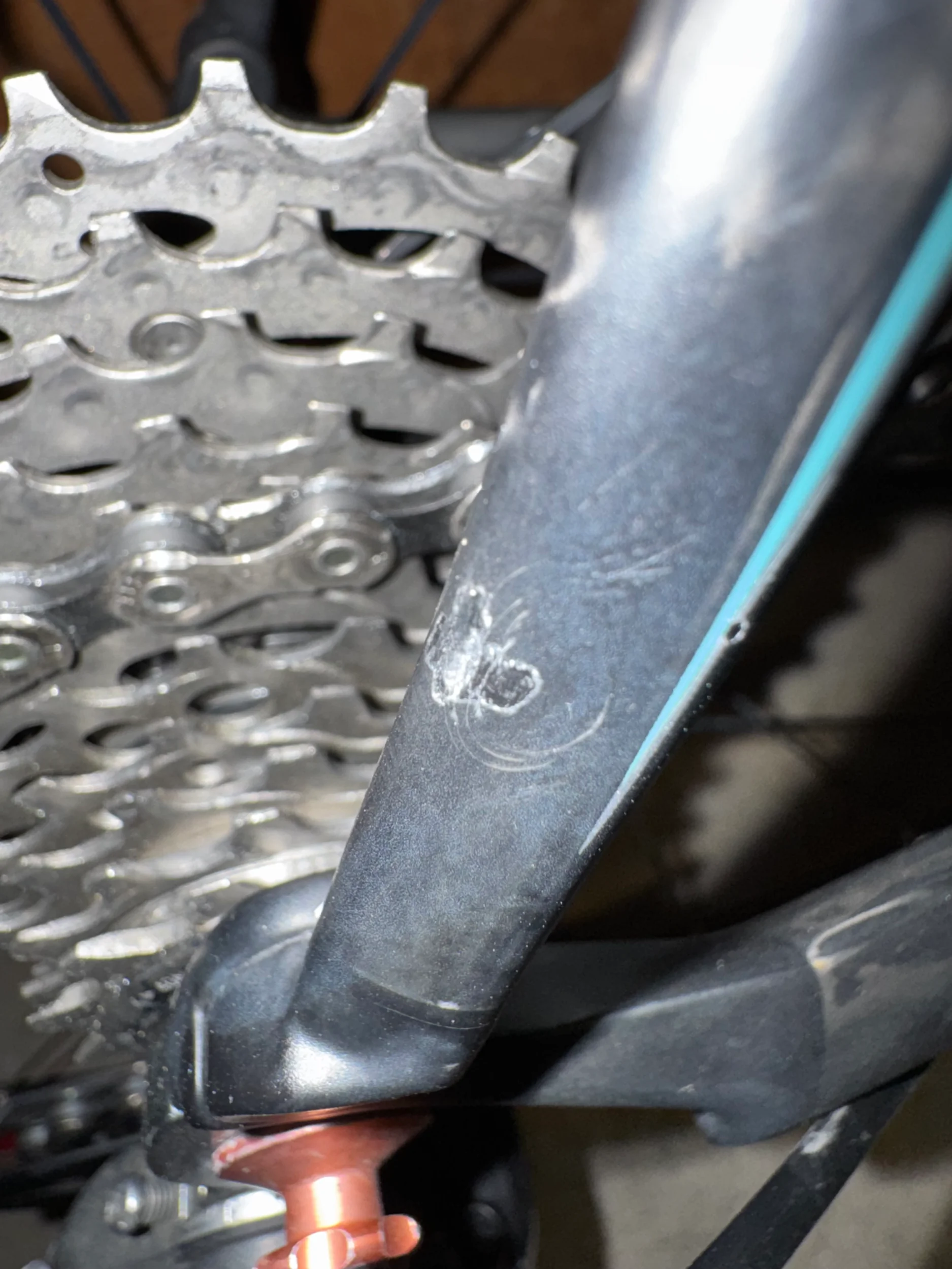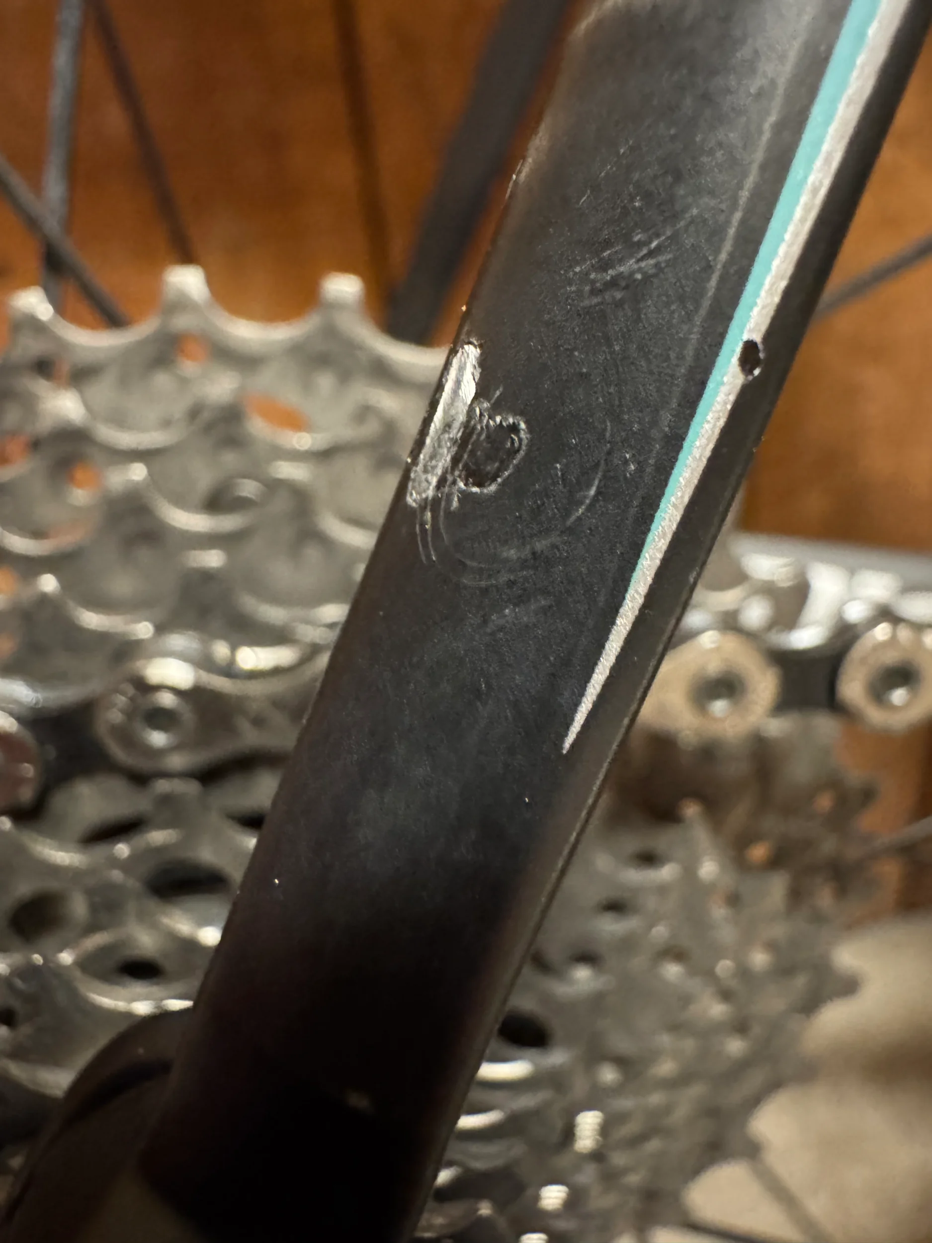 Upptäckte följande skada på sadelstaget/seat stay på min kolfiberram. Knackar jag enligt myttestet avviker ljuder och blir mer ”dovt”. Skada om cirka 5x5mm. Känns som ett lager material saknas, men inget krasande eller liknande om man trycker.