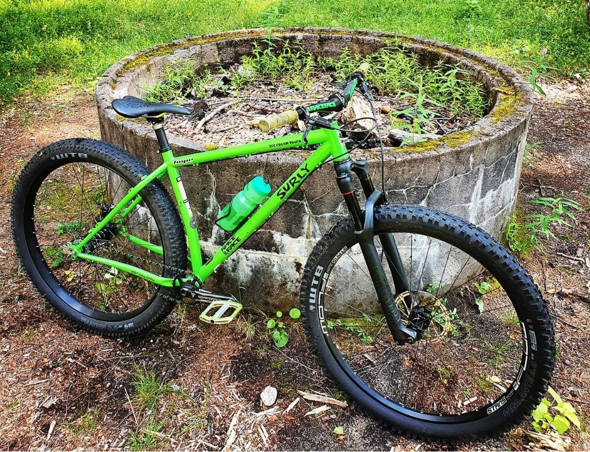 Det ser lite anorektiskt ut med så smala däck på fatbiken, och det "råkade" leda till inköp av en Mastodon då det slet lite väl mycket på gubbkroppen att köra helstel smalhjuling. :)