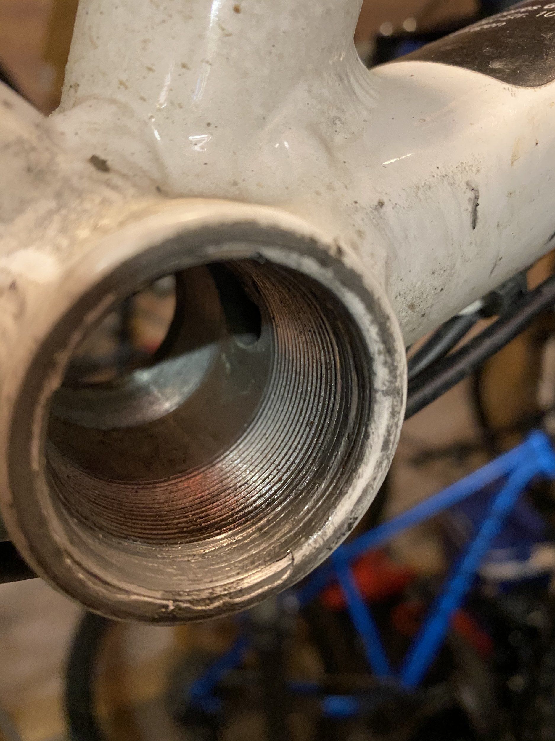 Jag hade gärna också haft en gängtapp för vevlager men det är ett ganska dyrt specialverktyg. Kostar väl en 3-8 000 kr eller något i den stilen.. Kan vara svårt att skära in rätt i den mosade gängan just i detta fallet också.