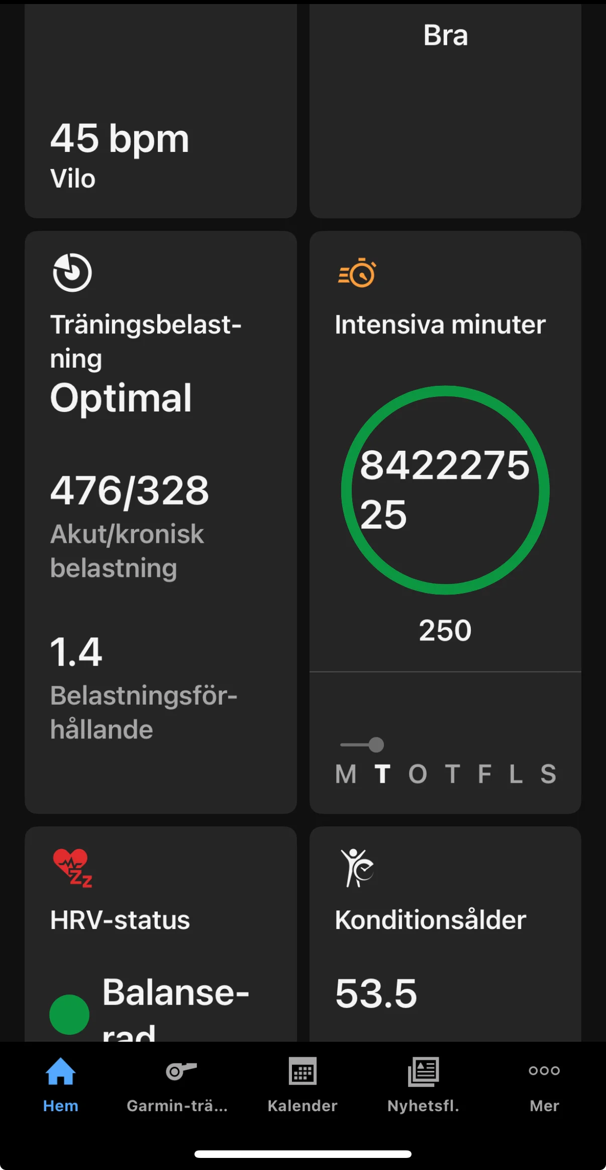 Jag måste ge Garmin rätt när det gäller tipsen till mig. Den klagar på att jag slarvar med högintensiv träning helt med rätta, jag håller ju helt med (men jag är strax 55 och lite mer bekväm av mig). Garmin verkar dock efterlysa regelbundna riktigt seriösa "nära döden pass" med mycket tid ett rejält snäpp över ftp, annars verkar det ju knappt ge utslag i statistiken. Tex om jag åtminstone ett par ggr/vecka snittar cirka 220-235W (med rätt höga toppar) på min ca 17 km pendlingsrunda och lägger mig ca topp 5 på varenda jäkla Strava segment (och känner mig helt utpumpad efteråt) ger det knappt utslag. 🥲