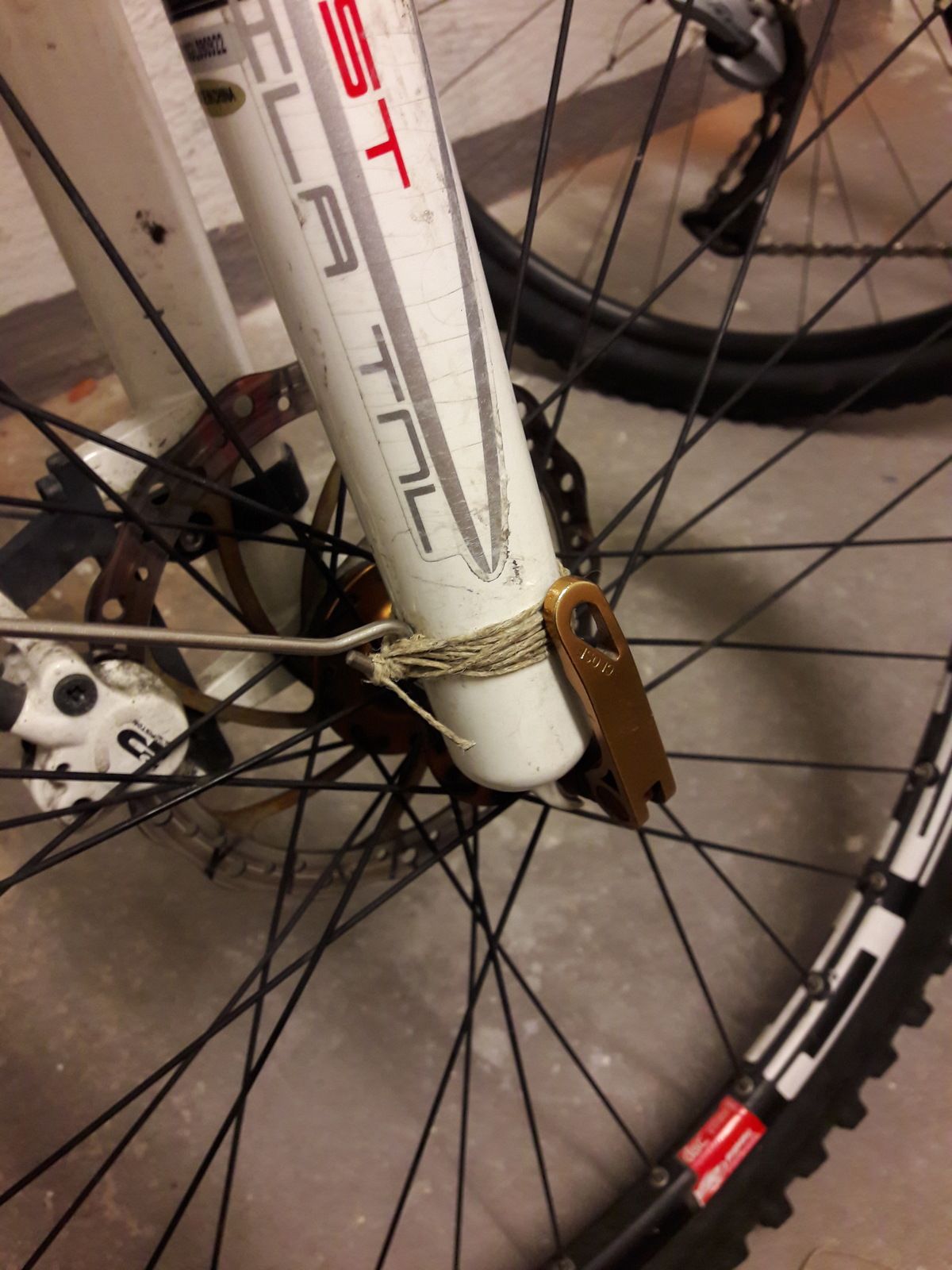 Denna alldagliga lilla bygel, som används för att fästa stänkskärmen på en gaffel som saknar fäste för stänkskärm, är så alldaglig att jag inte vet vad jag ska kalla den och därför har jag problem att hitta en ny. Närmaste cykelhandlare hade inget inne som liknade den, men jag antar att när jag väl vet vad den kallas så finns den där man köper skruvar och sånt.