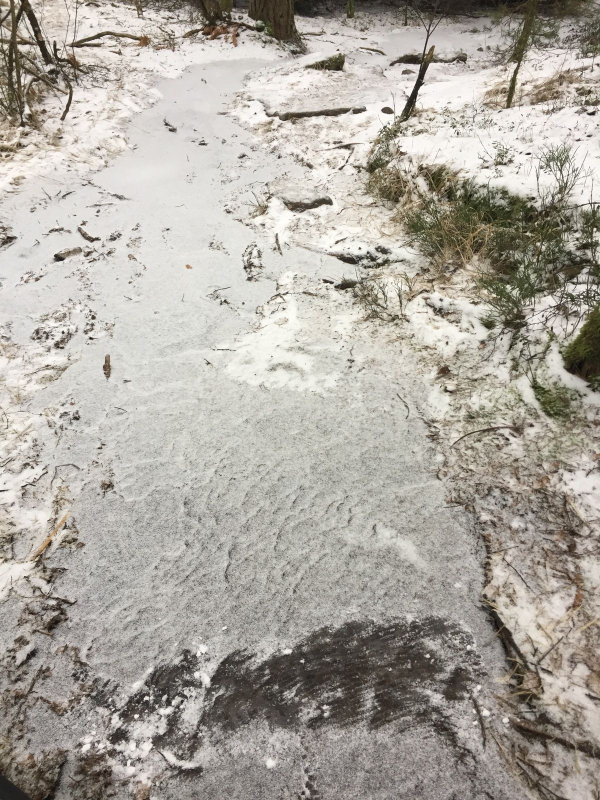 Tant-/promenadcyklade min nya fetcykel i Partille/Paradiset idag, mycket bra underlag till största delen! Hårt med bra knastrigt fäste, utom några få lömska ställen med svall-is över berghäll med en flortunt pudersnötäcke på. Samt några gamla surhål nu med is. Och några öppna bäckar.