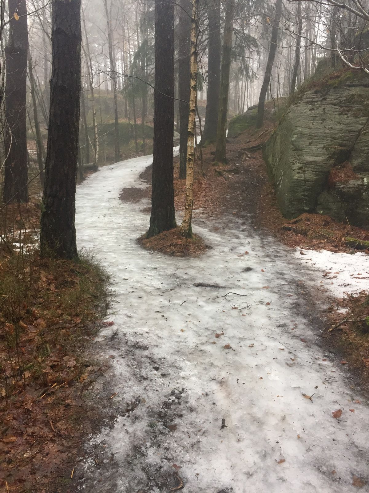 Den här bilden sammanfattar ganska väl underlaget i Partille Paradiset nu idag. Allt mellan snorhal is, skarsnö, snömodd/slask, knasterhård snö och underbar torr hård barmark!