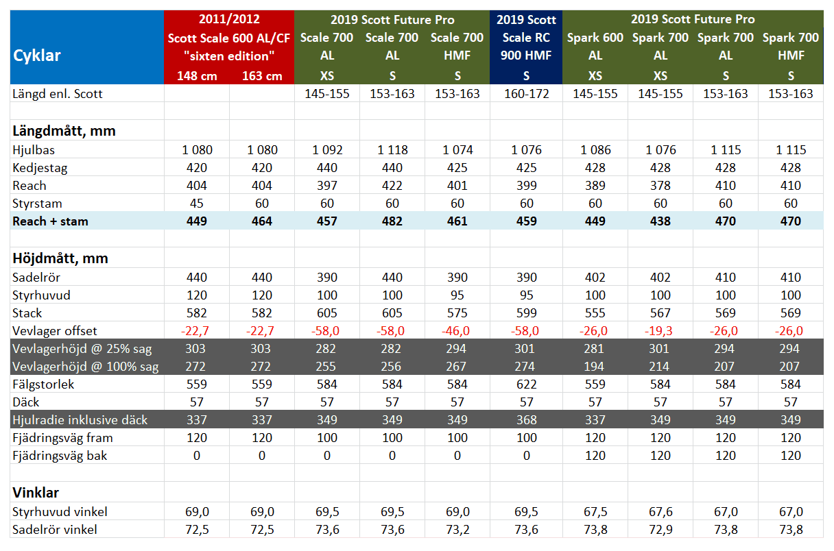 Tabell nedan. Den som är intresserad kan gå igenom alla måtten och fundera/reflektera. Värt att notera är att Scale 700 AL i XS för barn 145-155 cm har samma reach som Scale 900 RC i Small för "vuxna" 160-172 cm. Är båda rekommendationerna rätt? Eller är båda fel? Stämmer geotabellerna? När skall jag lita på Scott, när har de rätt och när har de fel? Jag litar på Sixten.
