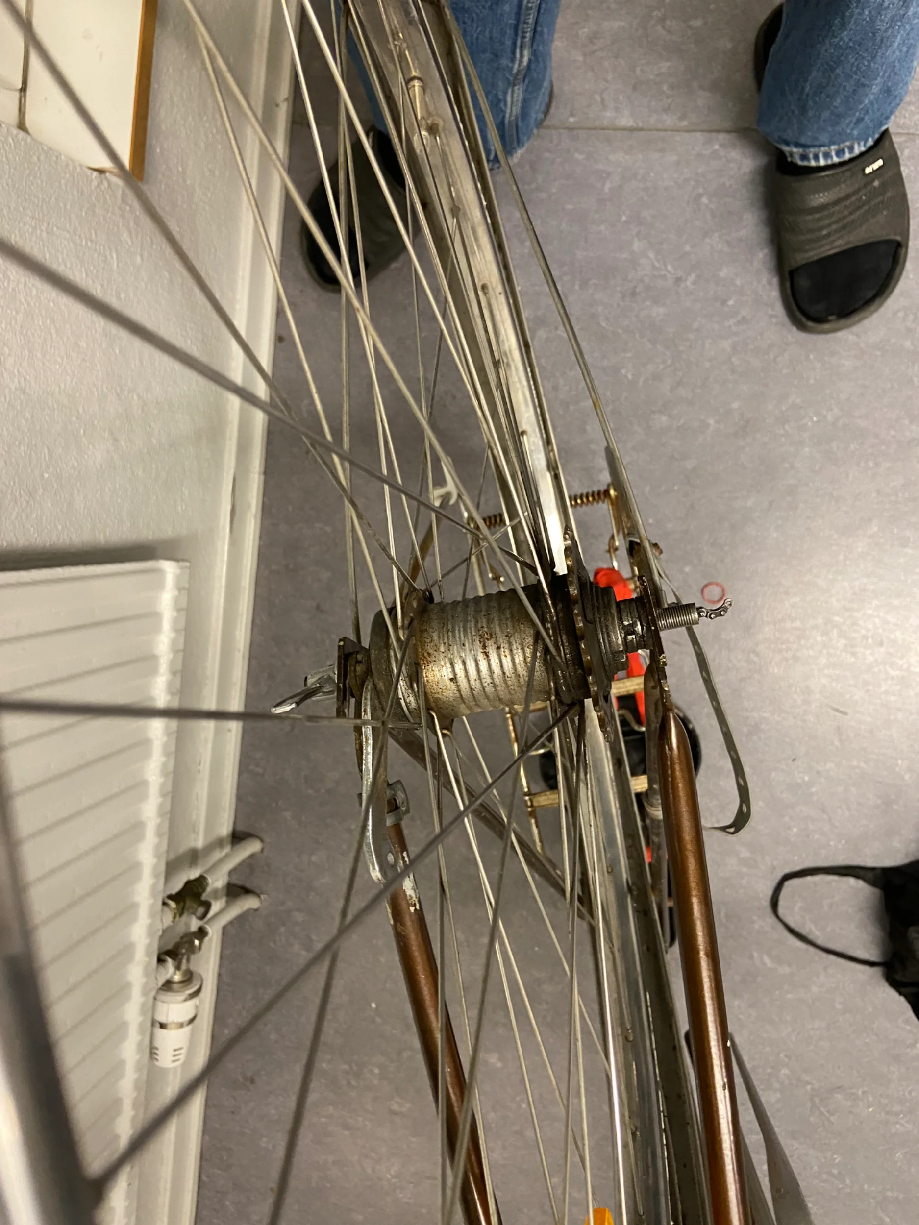 Jag tror att brickan med tänderna som sitter innanför staget borde sitta utanför med tänderna mot staget (så att den har mer grepp på staget och hjulet inte dras framåt). Det löser också problemet med muttern.