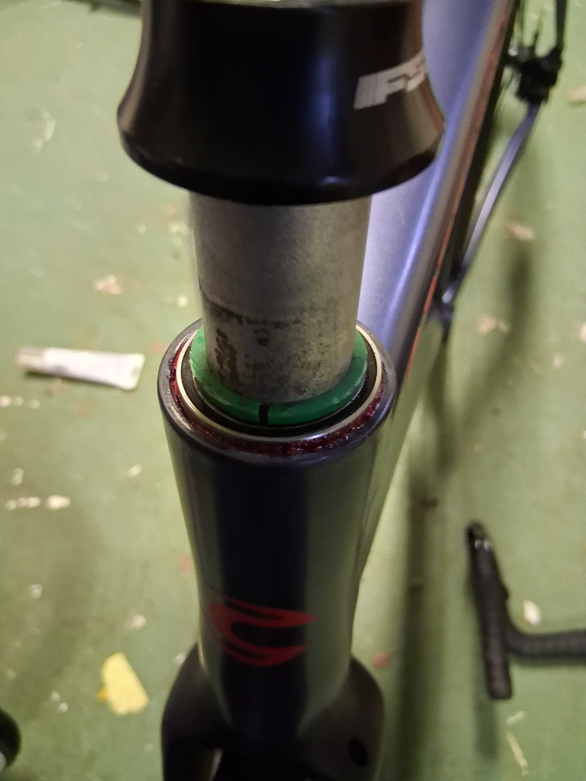 Den lilla plastringen (grön på bilden), vilken jag gissar har som uppgift att centrera och stabilisera styrrröret i lagrena går inte ner tillräckligt långt för att hamna i linje med det övre lagret. Detta innebär att den översta delen av styrlagret (locket? koppen?) inte går ner helt över lagret och en springa på några milimeter uppstår.