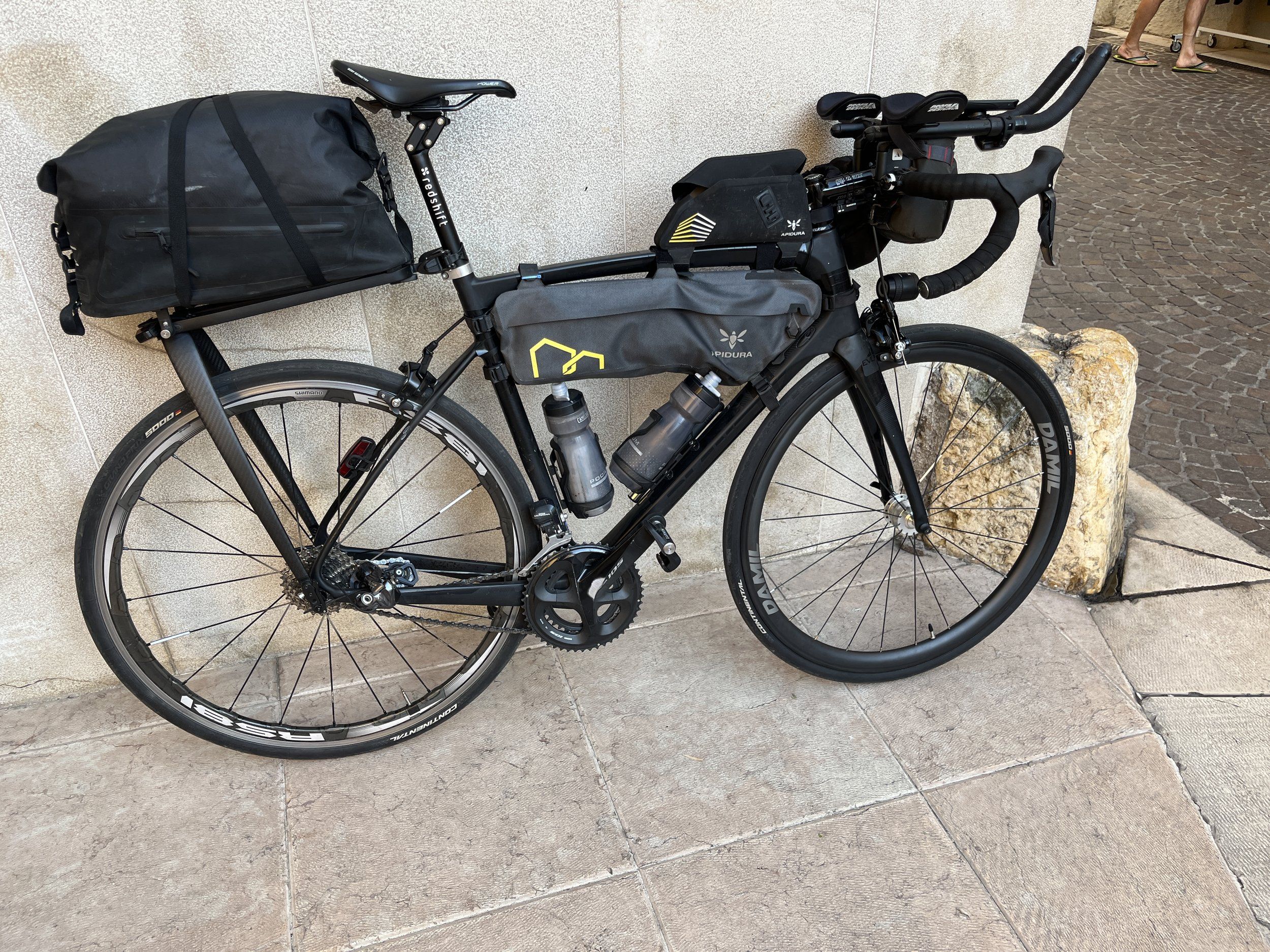 Hela tiden komplett mörker förutom sin lilla ljusbubbla. På något sätt visade GPS hela tiden några hundra meter till nästa korsning som ändå tog lång tid att komma fram till. Försökte sätta lampa som också lyste åt sidan för att kunna hitta någon plats att sova men det var ändå omöjligt.