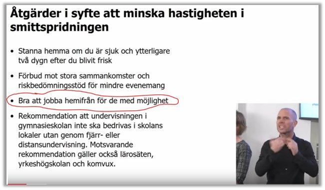 Var det verkligen det han sa? Mannen är ju otydligheten personifierad. "Kan vara en bra idé" att jobba hemifrån (om ok med arbetsgivaren).Le Bömb! Nu kom det, vi ska jobba hemifrån om vi kan