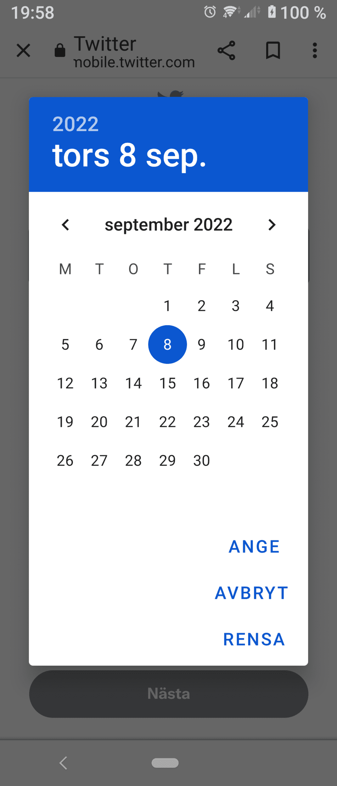 Nu gissar jag, men går det att klicka på årtalet? Högst upp till vänster alltså.Vet inte om detta räknas som datorfråga men iaf: försöker skaffa ett Twitterkonto och då måste man ange födelsedatum vilket man tydligen gör genom att scrolla månad för månad till rätt datum, eftersom jag börjar närma mid de femtio så blir det typ 600 månader att scrolla igenom... finns det något annat sätt?Visa bilaga 580239