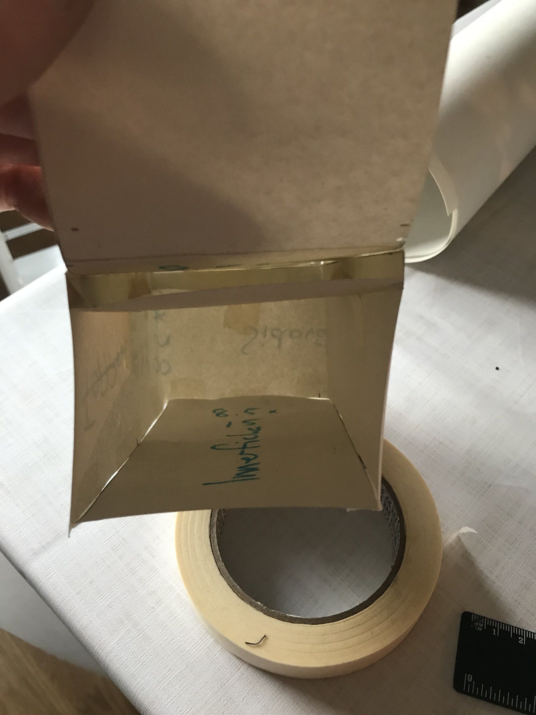 Utgå från ett tjockt papper. Jag använder en överbliven rulle av det där bruna pappret man lägger på golv vid målning. Då kan du måtta in de prylar du vill ha med. Klipp bort överskott med en sax, lägg ihop extrabitar samt sammanfoga med målartejp.