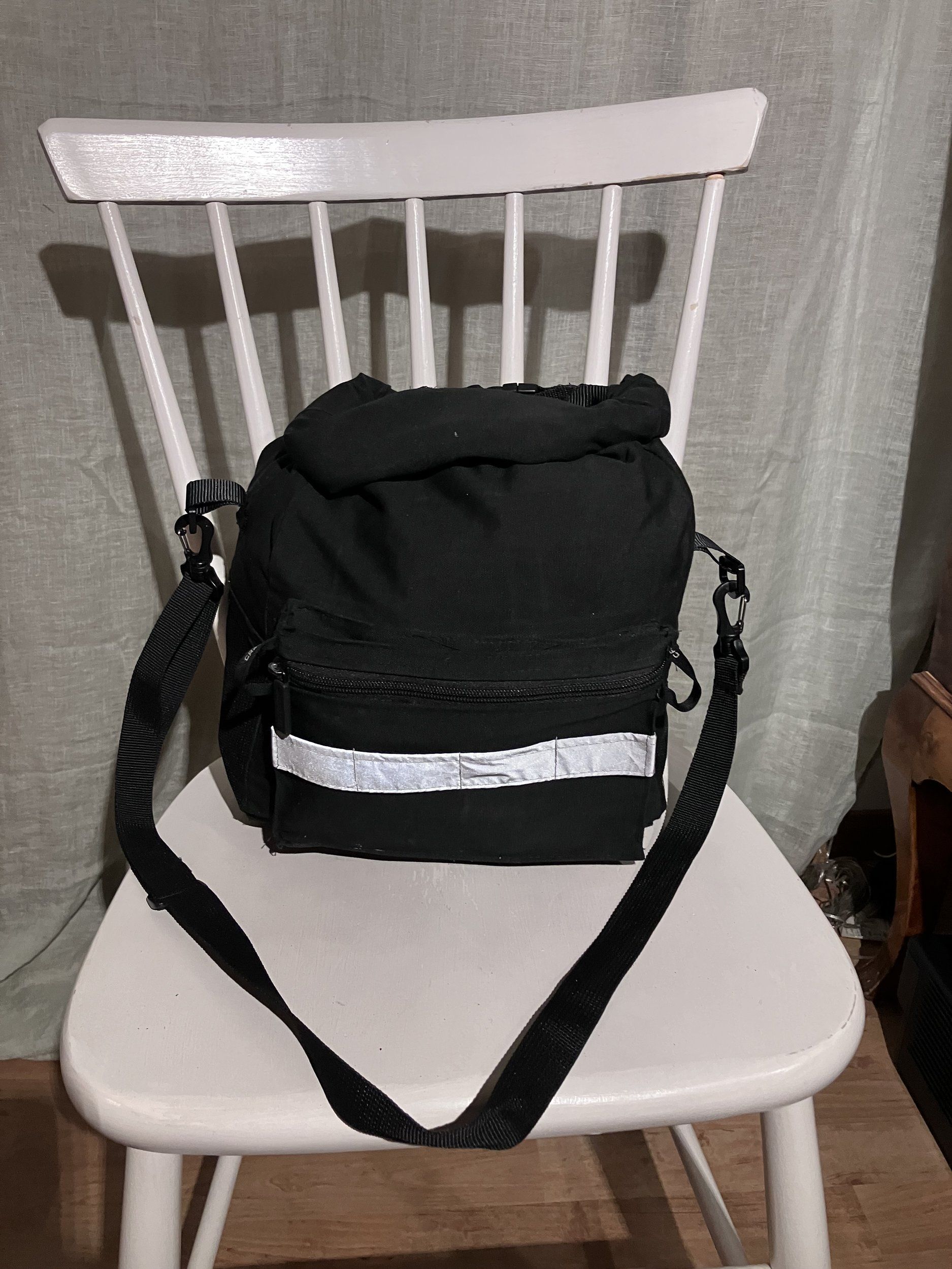 Rolltop är ju väldigt enkelt och billigt att sy, väskan går att expandera eller komprimera en del beroende på hur full den är och inget trillar ut:)
