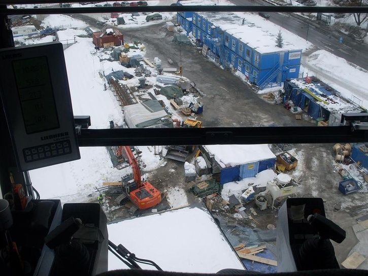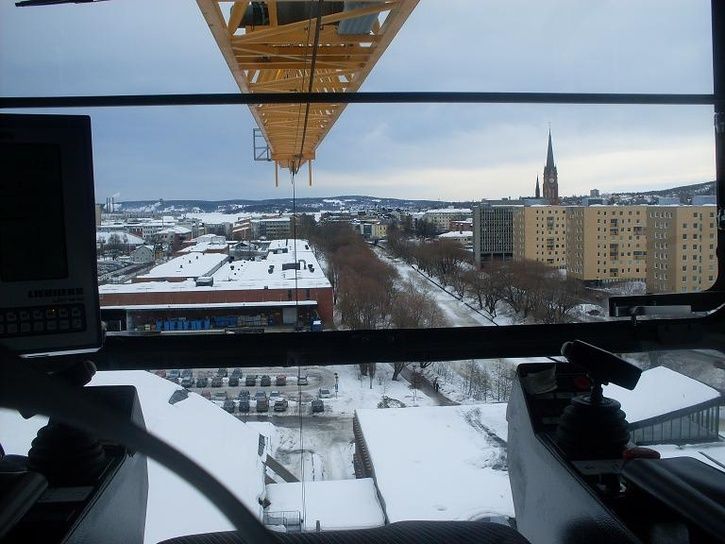 Skickar en bild från mitt jobb, "kontoret" ligger 30 meter upp. Har kört ca 35 - 40 kranar och den här är störst och bäst av dem alla. Den tar 3 ton längst ut på 70 meter, 12 ton lite längre in.