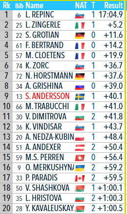 Ännu raskare avslutning på Zorc som slår Horstmann med en knapp sekund. Andersson nere som 9:a nu. Undrar dock om det finns någon mer åkare som kan slå henne nu.