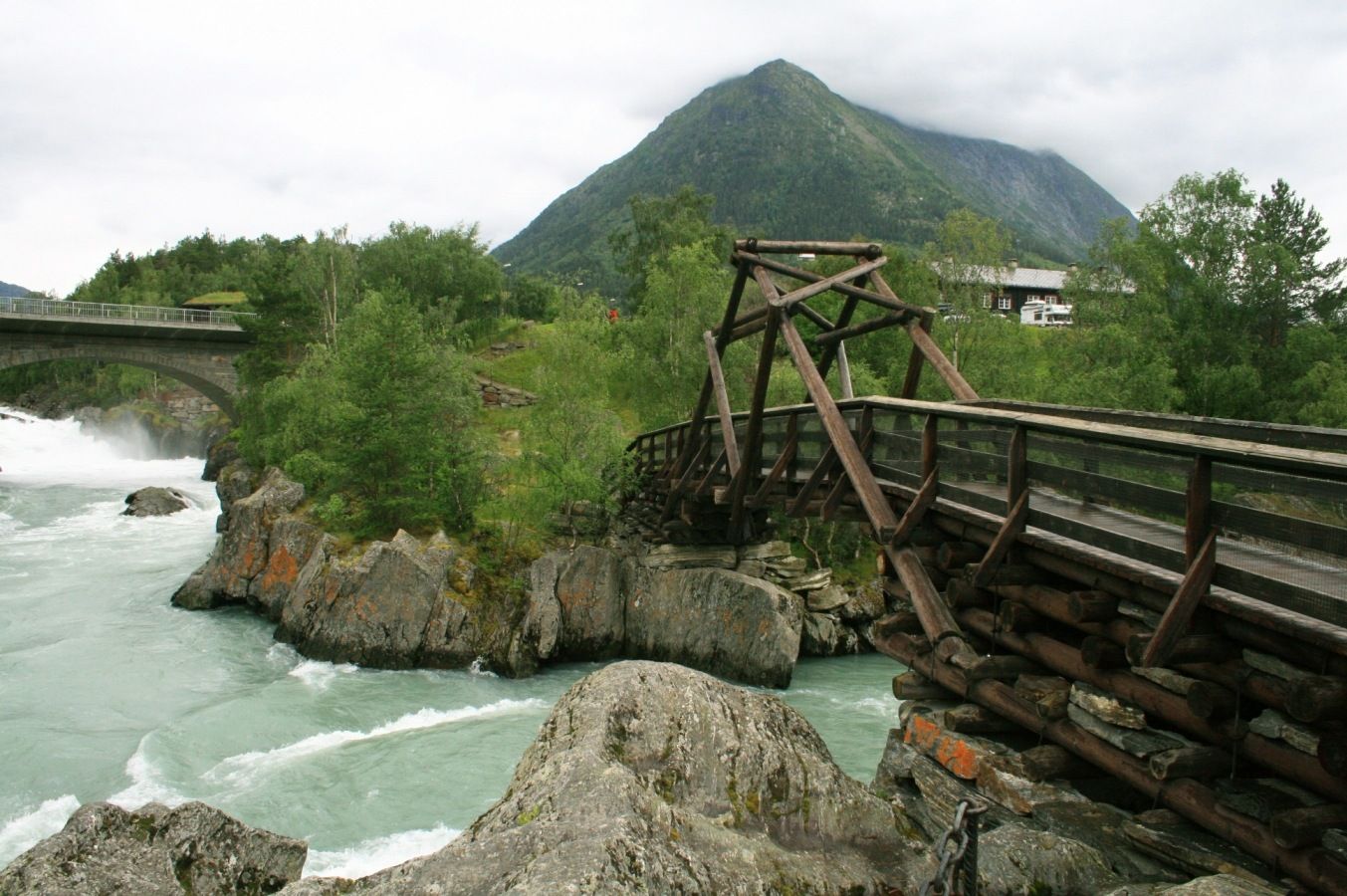 Bron är byggt från långa trädstammar och ovanpå ligger många tunga stenar för att inte de skulle flyga bort när det stormar.