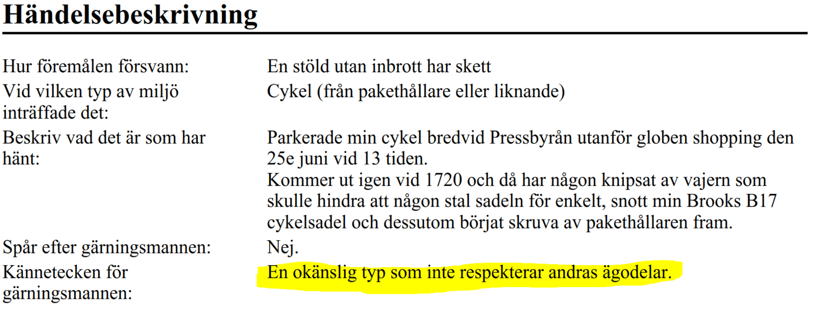 Kommer ut igen vid 1720 och då har någon jävel knippsat av vajern som skulle hindra att någon stal sadeln för enkelt, snott min bruna Brooks B17 och dessutom börjat skruva av pakethållaren fram.