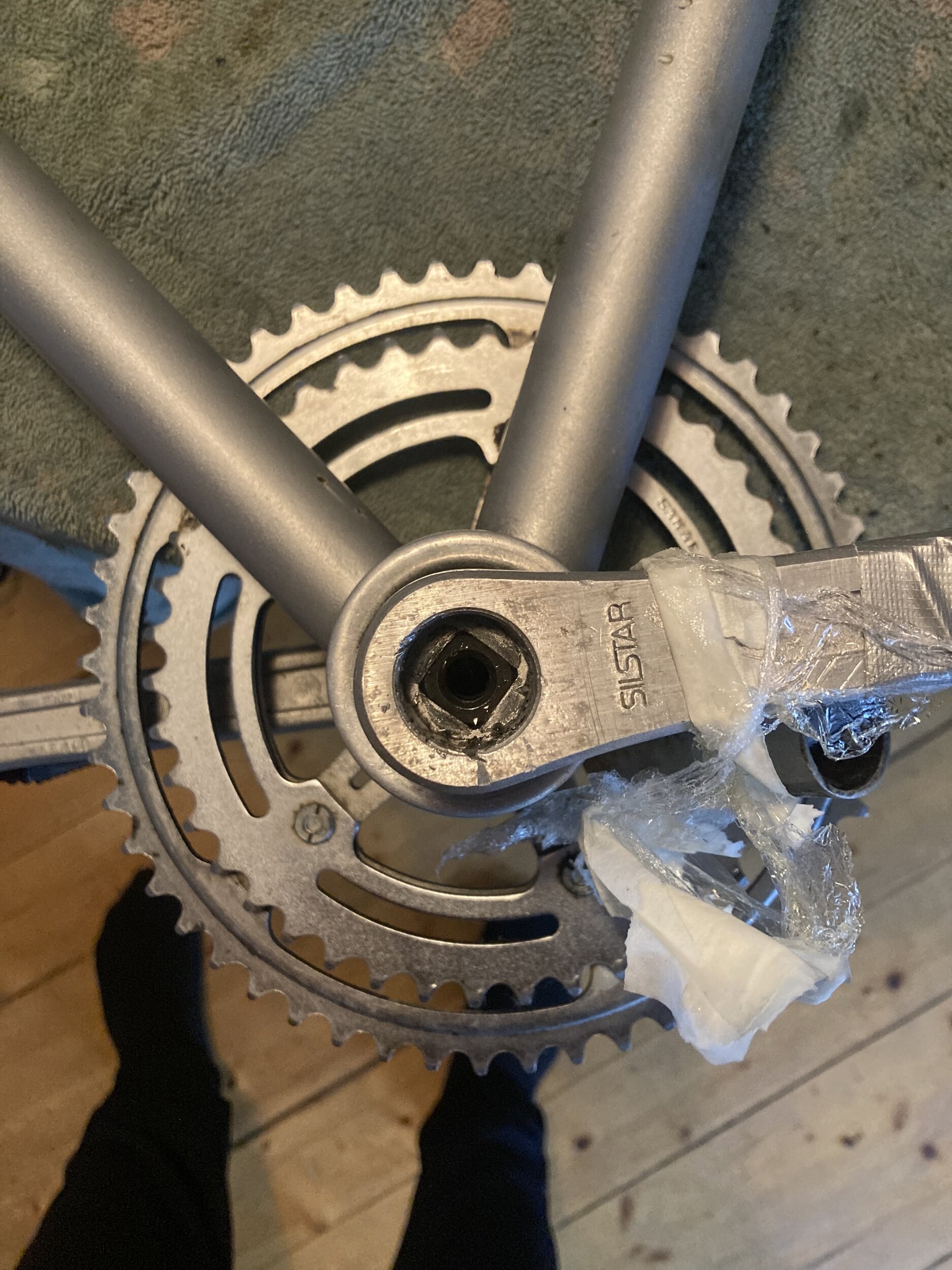 Det är svårt att se vilken typ av vevlager det är men om det är den gamla typen behöver inte drivsidans vevarm lossas.Ska jag börja med specifik sida för lättare hantering? Funkade att lossa icke drivsida först gällande vevbulten. Drivsidan satt som fan.