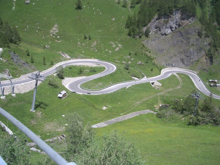 Slingervägar ner från Fedaiapasset. Liften som går över vägen är den man tar från Marmoladasystemet tillbaks till Arabba.