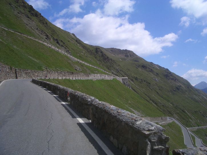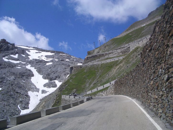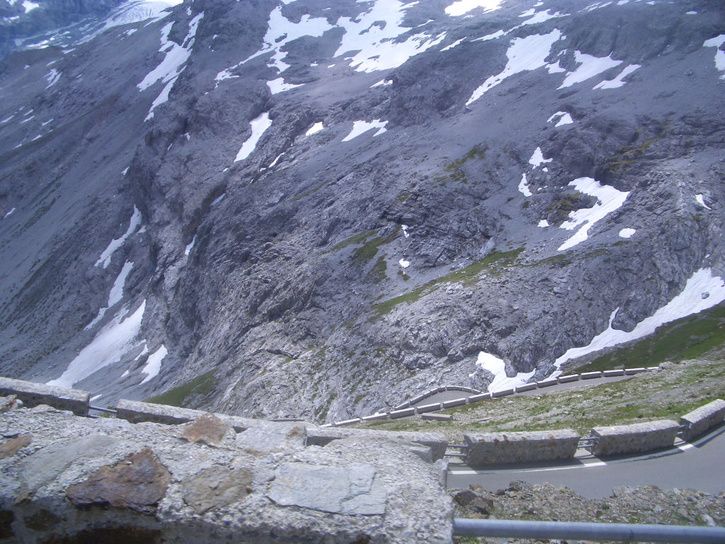Då var "monstret" besegrat. Ca 25 km konstant uppför eller 1857 höjdmeter från Prato till toppen av Stelvio passet. Ett kort stopp(ca 5 minuter)efter 1300 höjdmeters klättring, för påfyllning av vatten och käka den sista "Gelen", därefter vidare mot toppen. Ca 20 grader i Prato i morse men bara 3-4 grader på toppen. Rutinerad som man är efter 2 år som cyklist ,så hade man givetvis både benvärmare samt vindjacka med:) Det behövdes på resan ner. Det var först nere på ca 1500 möh, som det blev lite värme i luften. Resan upp gick dock i kortärmat/kortbyxor och det utan problem. Solen lyste största delen av tiden samt vinden var måttlig. Avundades dock ej de som jag mötte på vägen ner, eftersom vinden samt molnigheten ökade på rejält den tid jag var på toppen(ca 1 timme)